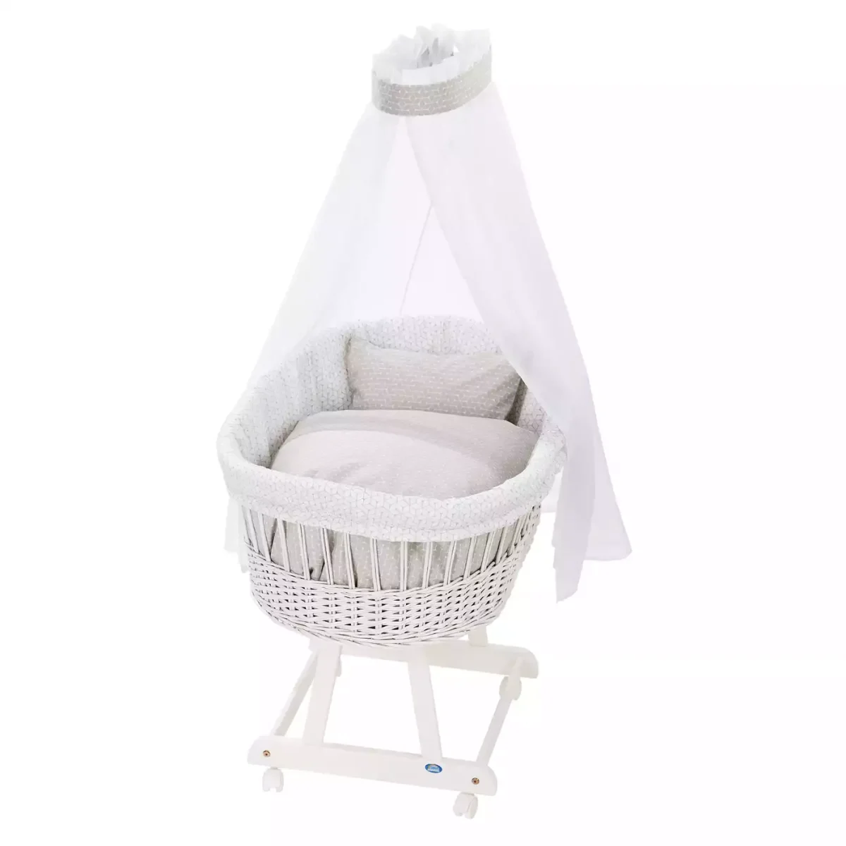 In diesem wunderschönen Stubenwagen Birthe Raute grey von Alvi wird sich das Baby nach der Geburt sicher wohl fühlen. Er überzeugt durch sein massives Untergestell aus Kiefer und dem Korb aus handgeflochtener Weide.