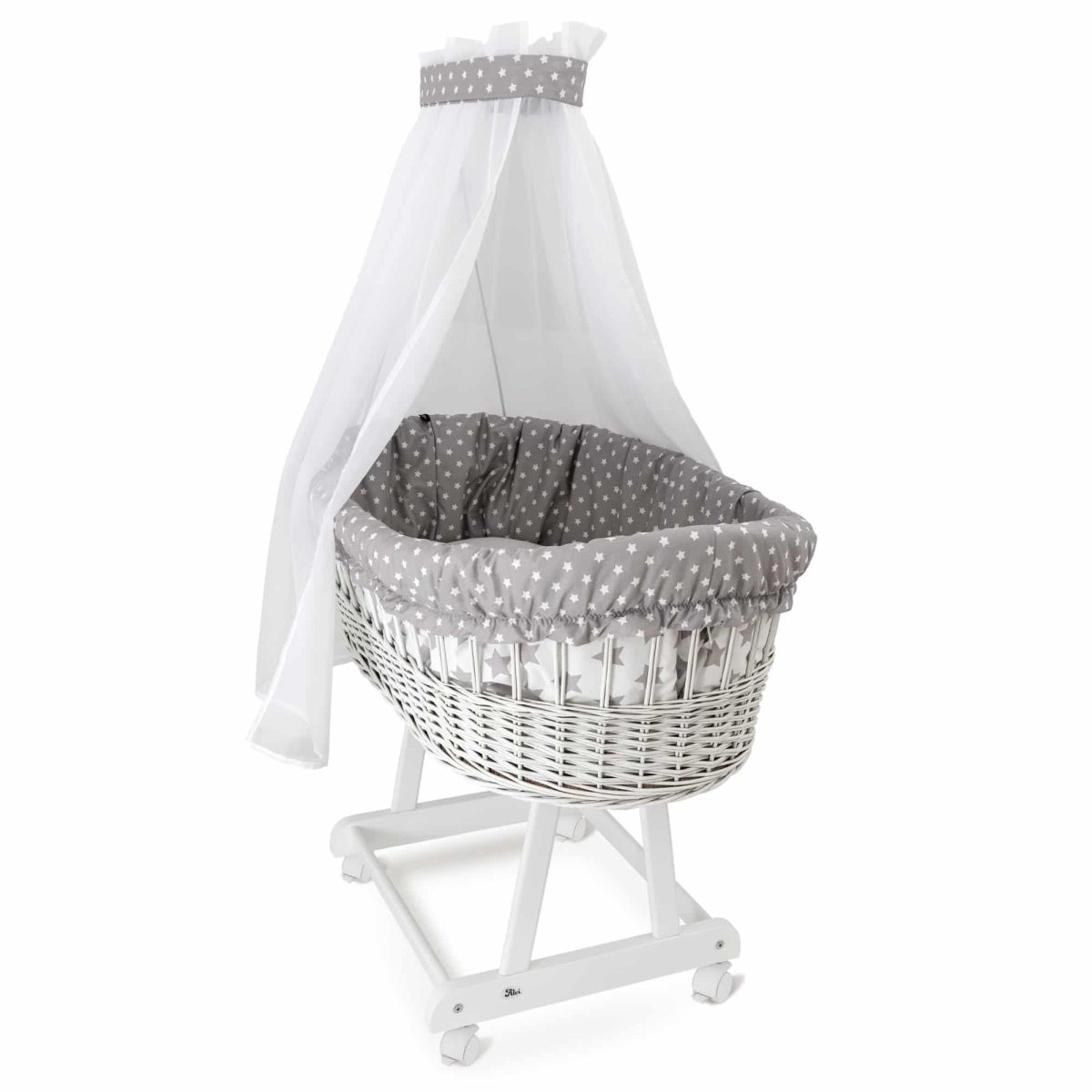 Der Stubenwagen Birthe von Alvi ist genau das Richtige für dein Baby! In einem entzückenden „Stars“ Design in Silber und Weiß gehalten wird dieser vollmassive Kiefern-Stubenwagen sicherlich das Highlight im Kinderzimmer sein. Der handgeflochtene Weidenkorb bietet nicht nur eine besonders großzügige Liegefläche von etwa 46 x 80 cm, sondern verleiht auch eine warme und gemütliche Atmosphäre.