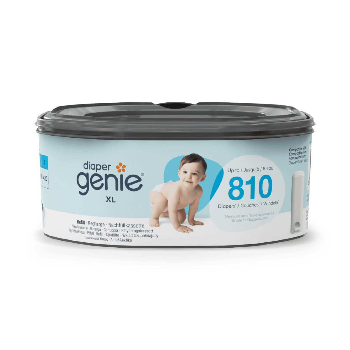 Die besonders ergiebige XL Nachfüllkassette von Angelcare für den Diaper Genie Windeleimer beinhaltet 18 Meter durchgehende, mehrschichtige Folie, die bis zu 810 Windeln in Neugeborenengröße aufnehmen kann. Das reduziert den häufigen Kassettenwechsel und -kauf und ebenso den Kunststoffabfall erheblich – so habt ihr Zeit für die wirklich wichtigen Dinge.Die mehrschichtige Folie lässt sich auf jede beliebige Länge zuschneiden. Die geruchshemmende Barrieretechnologie verhindert wirksam das Entweichen starker Windelgerüche.