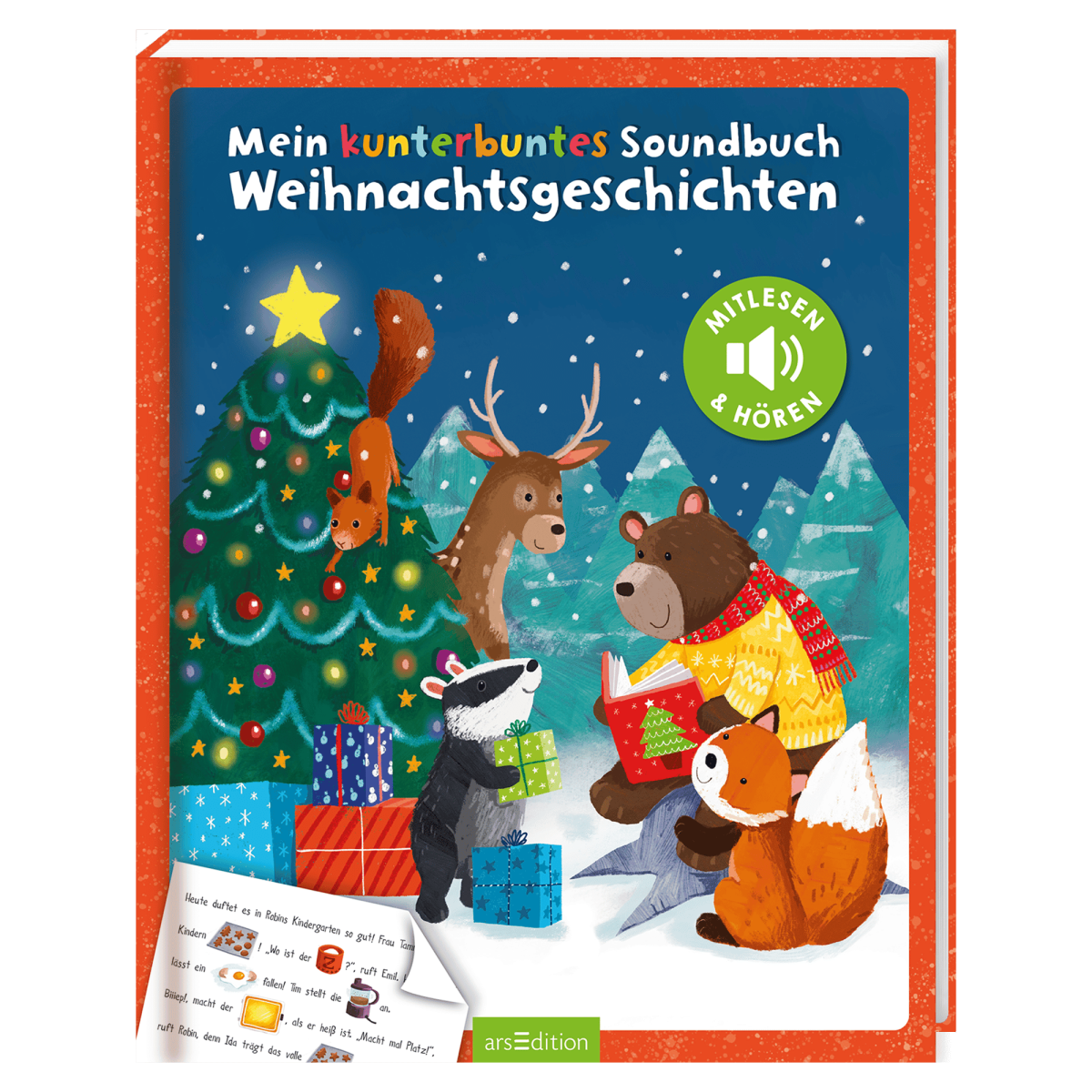 In dem wunderschönen Buch Mein kunterbuntes Soundbuch – Weihnachtsgeschichten von arsEdition bieten sieben lustige Geschichten einen allerersten weihnachtlichen Vor- und Mitlesespaß für deinen kleinen Schatz ab ca. 2 Jahren. Kleine Bilder im Text laden zum Suchen ein und lassen die Geschichten auf Knopfdruck lebendig werden.