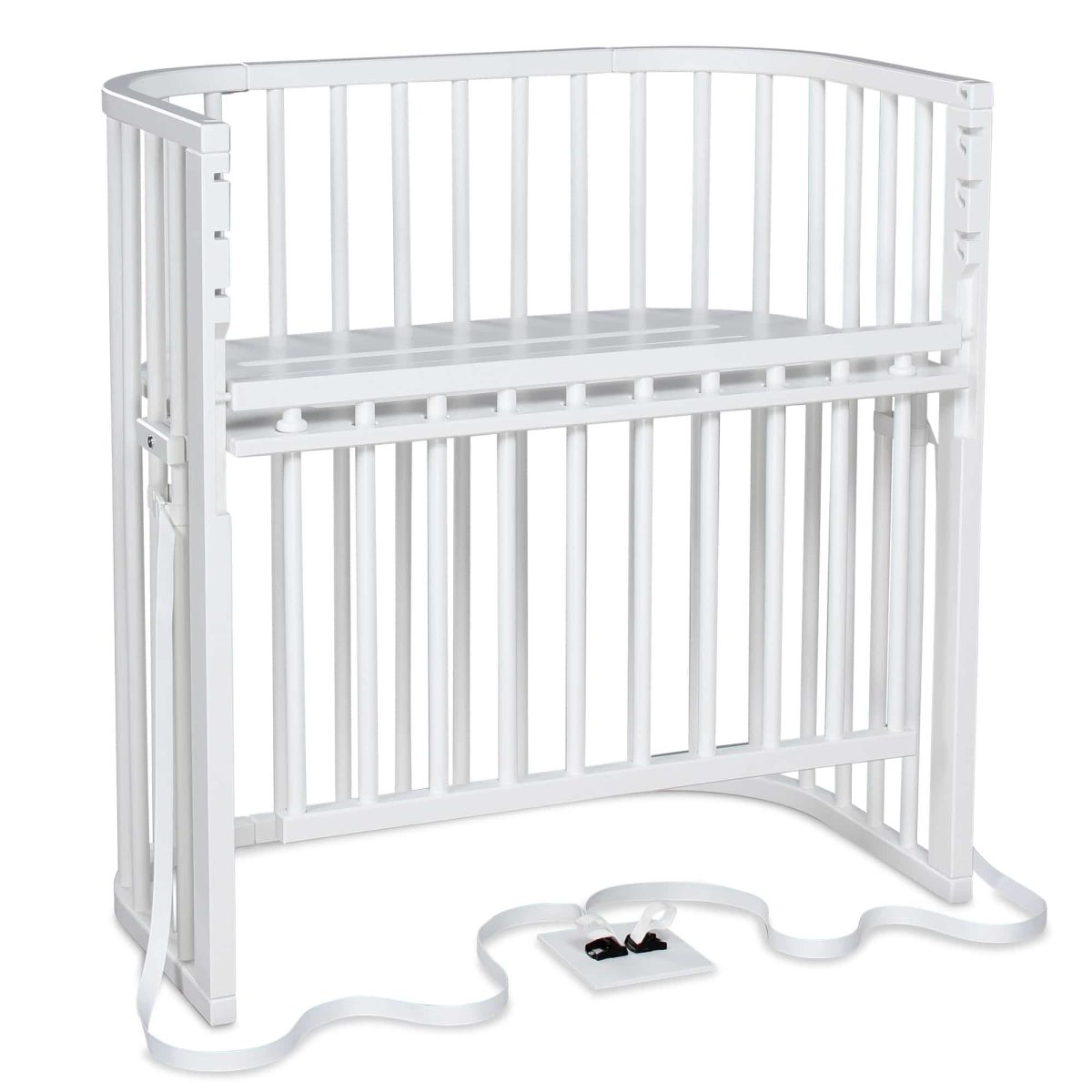 Das Beistellbett mit integriertem und verstellbarem Herausrollschutz bietet nachts noch mehr Sicherheit. Ist das Verschlussgitter heruntergelassen, schließt die Oberkante des Herausrollschutzes exakt mit der Oberfläche der Matratze ab und bietet somit eine Ebene mit der Elternbettmatratze. Mit nur einem Handgriff lässt es sich in ein vollwertiges und freistehendes Säuglingsbett verwandeln.