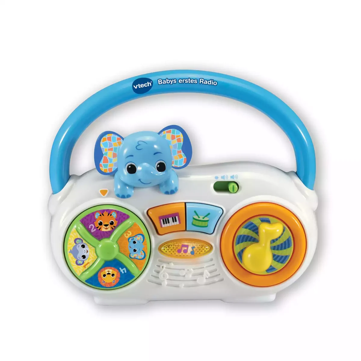 Babys erstes Radio von Vtech sorgt für jede Menge musikalischen Lernspaß! Zahlreiche Lieder und Melodien in unterschiedlichen Musikstilen laden deinen kleinen Schatz zum Singen und Tanzen ein. Über die verschiedenen Tasten und Drehscheiben wird die Musik ausgewählt und dein Kind lernt nebenbei Tiere, Zahlen und Tiergeräusche kennen. Dank des Tragegriffs kann es überall mit hingenommen werden.