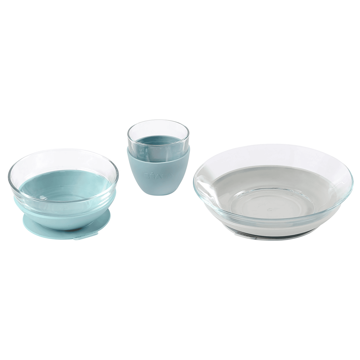 Dieses Glas-Geschirrset von BÉABA für Kleinkinde besteht aus einem Glasteller mit weichem Saugnapf an der Unterseite, einer Glasschale mit weichem Saugnapf an der Unterseite und einem Glasbecher mit einer flexiblen Glasabdeckung.
