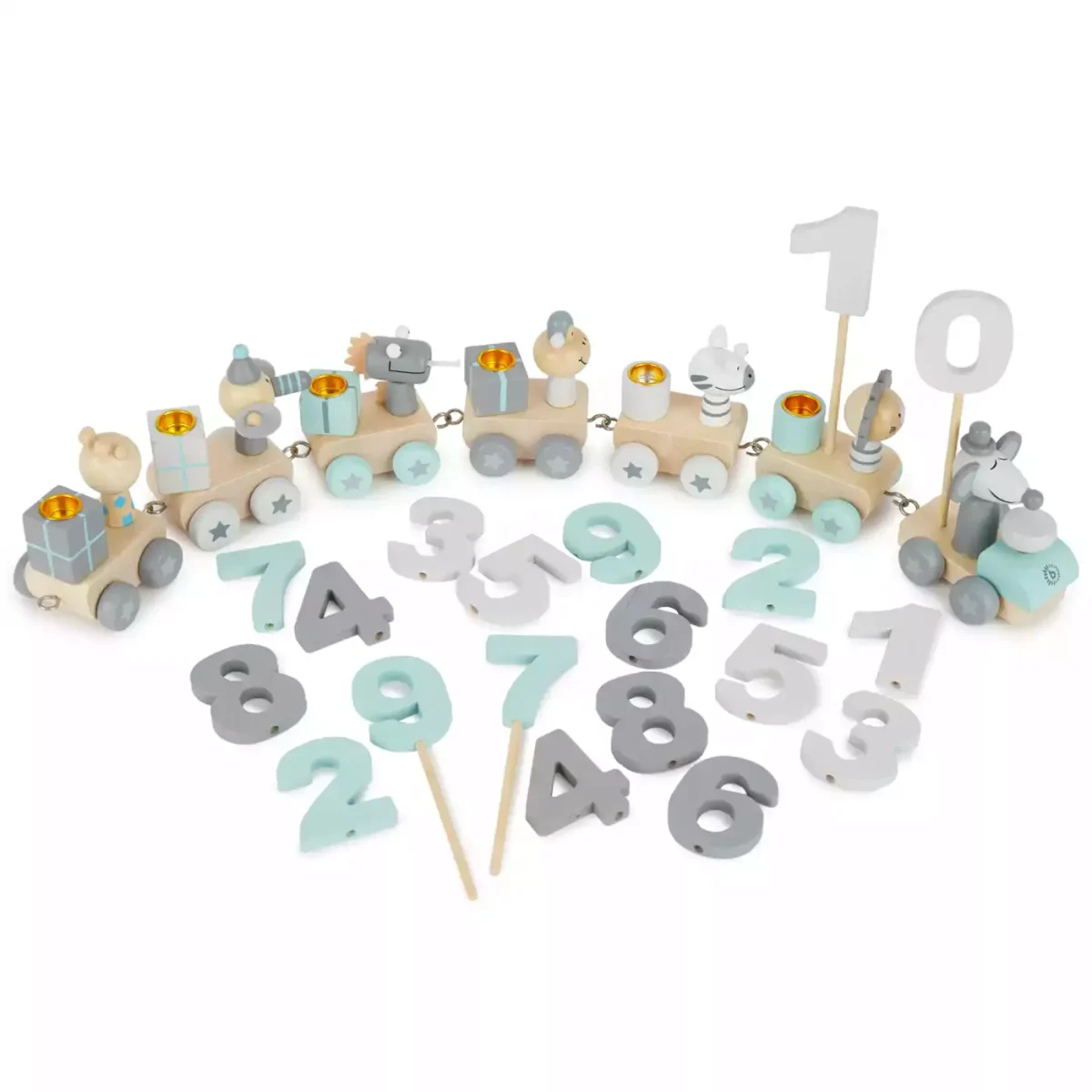 Der wunderschöne Geburtstagszug aus hochwertigem Holz von Bieco ist die perfekte Ergänzung für jeden Geburtstagstisch. Er besteht aus einer Lok und sechs niedlichen Anhängern in Tierform. Die verschiedenen Zahlen sind inklusive und können einfach in den ersten beiden Wagen reingesteckt werden.