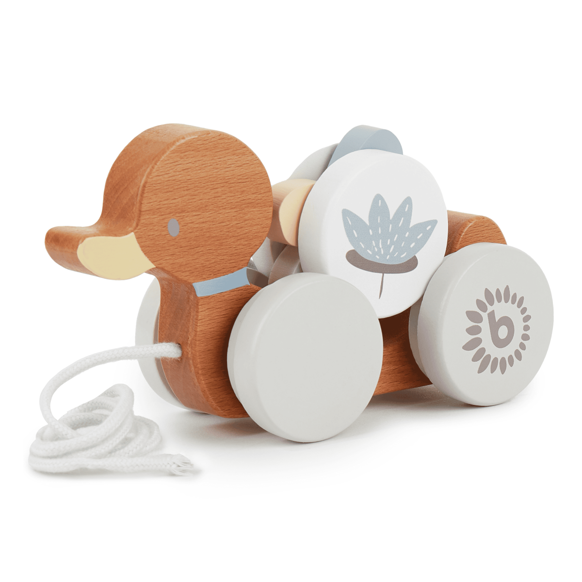 Mit der entzückenden Nachzieh-Ente von Bieco wird das Abenteuer des Laufenlernens für dein kleines Wunder zu einem echten Vergnügen! Dein kleiner Schatz kann die lange Schnur beim ersten Gehversuch fest in der Hand halten und schon rollt die Ente auf ihren vier hölzernen Rädern hinterher. Das kleine Zahnrad auf dem Rücken der Ente dreht sich mit und erzeugt dabei fröhliche Geräusche, die die Aufmerksamkeit deines Nachwuchses wecken. Außerdem kann es abgenommen und erforscht werden.