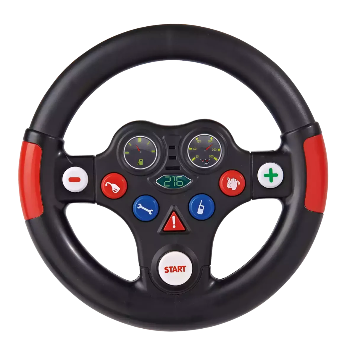Das Soundlenkrad BIG Racing Sound Wheel ist das ideale Zubehör für alle kleinen Nachwuchsrennfahrer und passt auf alle BIG-Bobby-Car (New und Classic) ab Baujahr 2010 sowie an alle BIG-Traktoren. Hinter acht verschiedenen Tasten verbergen sich Geräusche aus der Welt des Rennsports. Los geht es mit dem typischen Startsound eines Rennautos. Schnell noch tanken und die richtigen Räder aufziehen, dann geht es schon ab auf die Rennbahn. Mit dem Plus-Knopf rechts kann der kleine Rennfahrer einen Gang nach oben schalten, bei Bedarf lassen sich mit dem links platzierten Knopf wieder Gänge nach unten schalten. Die nötigen Anweisungen erhält der kleine Fahrer durch Druck auf die Taste mit Funk-Symbol. Dann ertönt der bekannte Boxenfunk. Ist die Rennstrecke nicht befahrbar, kann der Fahrer die Safety Car Sirene betätigen. Auch für den Beifall haben die findigen Entwickler von BIG eine eigene Taste eingebaut.