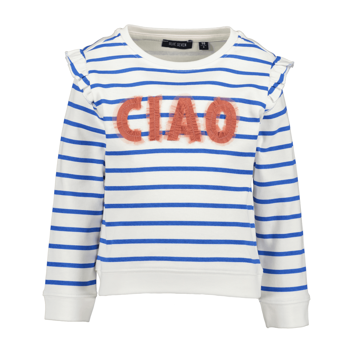 Das Sweatshirt Ciao von Blue Seven bringt mit seinem fröhlichen Streifendesign und dem flauschigen Schriftzug italienisches Flair in die Garderobe deines kleinen Lieblings. Der weiche Baumwollstoff sorgt für ein angenehmes Tragegefühl, während Rüschen an den Schultern dem Look eine verspielte Note verleihen. Perfekt für die Übergangszeit und unkompliziert durch elastische Bündchen an Ärmeln und Saum.