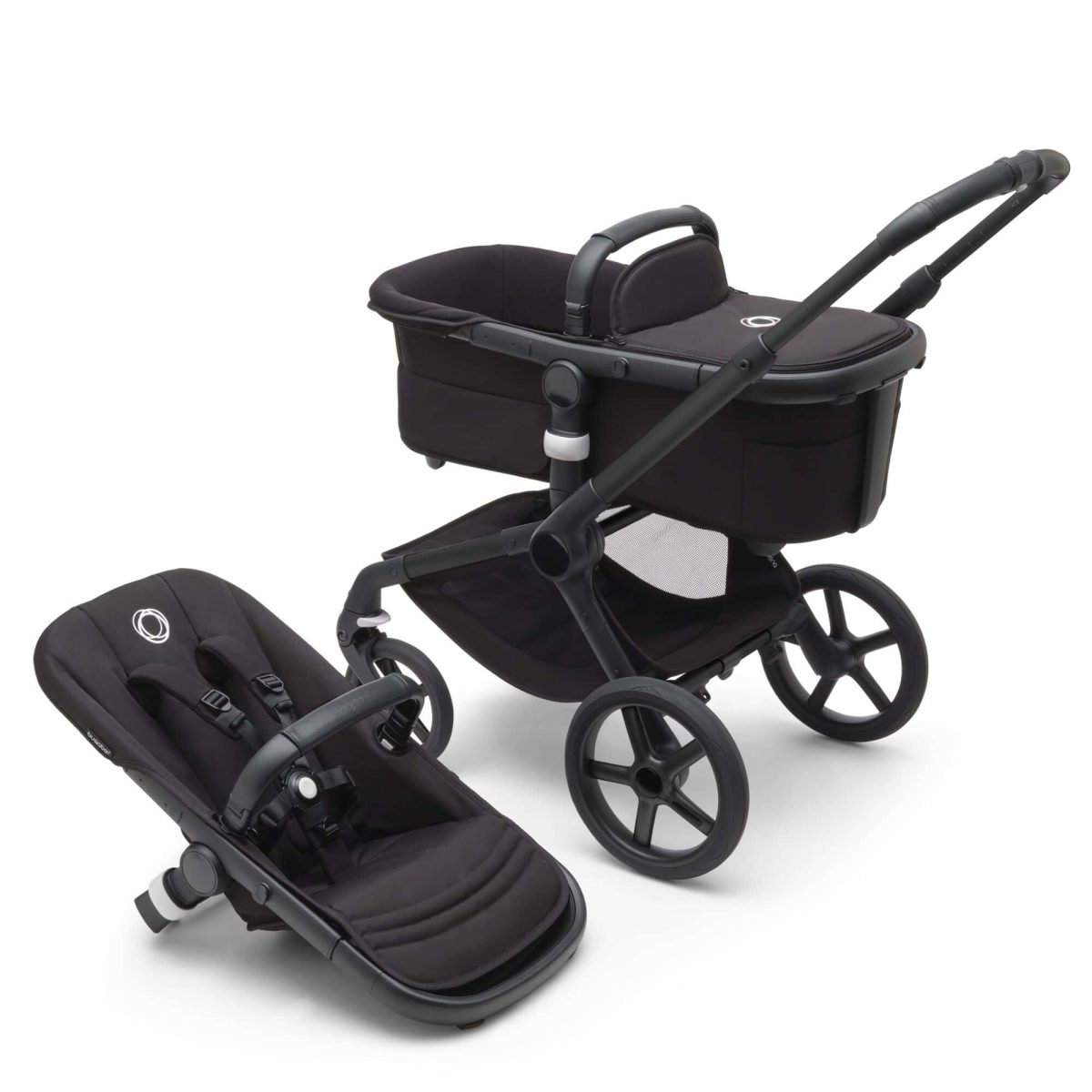 Mit den bugaboo Fox 5 Basiselementen erhältst du ein umfangreiches Set – ein leichtes, schwarzes Gestell mit Rädern und Griffen, einen ergonomischen, mitternachtsschwarzen Sitz sowie eine mitternachtsschwarze Liegewanne mit luftdurchlässiger Matratze. Ein Sonnendach ist nicht mit im Lieferumfang enthalten – dies ist separat in vielen verschiedenen Farben erhältlich. So kannst du deinen Kinderwagen individuell stylen. Im großen Korb mit ausziehbaren Klappen finden zusätzlich alle wichtigen Utensilien einen Platz.