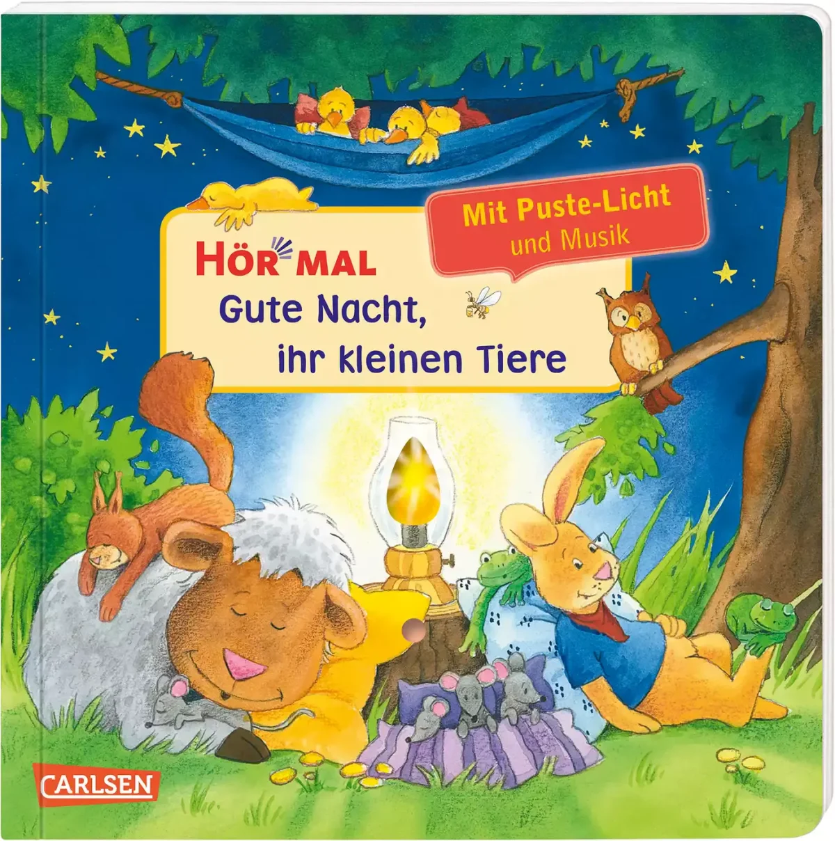 Die Schafherde auf der Wiese, der kleine Eisbär, die Entenküken, die kleinen Eichhörnchen, die Mäusekinder und die Häschen – alle müssen schlafen gehen. Aber bis sie einschlummern, brauchen sie noch einen Kuss oder ein Kuscheltier, eine Vorlesegeschichte oder eine Wärmflasche. Auf jeder Doppelseite wartet eine liebevolle Zubettbringszene mit einem gereimten Sechszeiler auf deinen kleinen Leser ab 2 Jahren. Und wer den Button drückt, stellt das Schlummerlicht an und kann in gewohnter Hör Mal-Qualität Naturgeräuschen, Sprechern und Musik lauschen. Doch diese Hör-Mal-Reihe kann noch mehr: Der Leser kann jede Einschlafgeschichte zu einem krönenden Abschluss bringen, wenn er schließlich das Licht selbst auspustet und damit zugleich beruhigende Klänge und bekannte Gutenachtlieder auslöst. Enthält unter anderem „Der Mond ist aufgegangen“ (J.A.P. Schulz), „Wer hat die schönsten Schäfchen“ (J. F. Reichardt) und „Guten Abend, gut Nacht“ (Johannes Brahms).