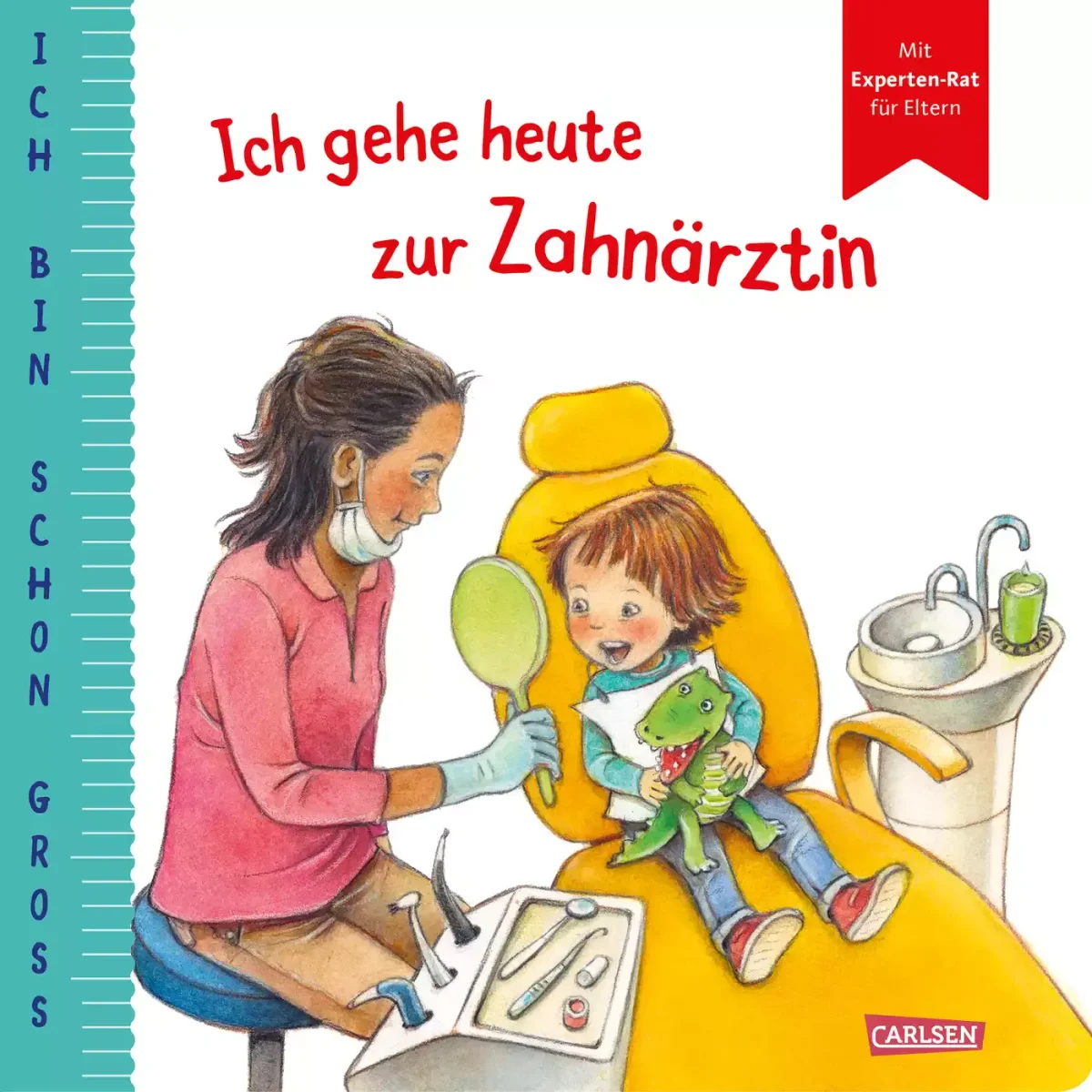 In dem Buch Ich bin schon groß: Ich gehe heute zur Zahnärztin von CARLSEN geht es um Luis, der heute zur Zahnärztin geht. Dr. Gupta schaut, ob seine Zähne gesund sind. Papa kommt mit und Kroko, Luis Kuschelkrokodil, hat auch einen Wackelzahn. Erst schauen sich Luis und Kroko alles ganz genau an und dann machen beide ihren Mund weit auf. Toll gemacht!