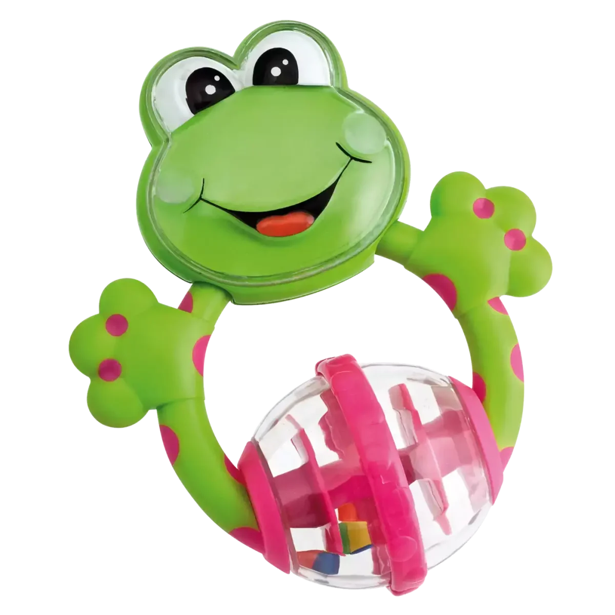 Die Rassel Frosch ist für Babys kleinen Hände ganz leicht zu halten. Sie besteht aus weichen Kunststoffteilen, die in der Zahnungsphase helfen. Der Frosch ist mit beweglichen, bunten Ringen ausgestattet, die die Koordination fördern. Das Gesicht des niedlichen Greiflings mit Rassel weckt die Aufmerksamkeit der Kleinen und zaubert ihnen ein Lächeln ins Gesicht.