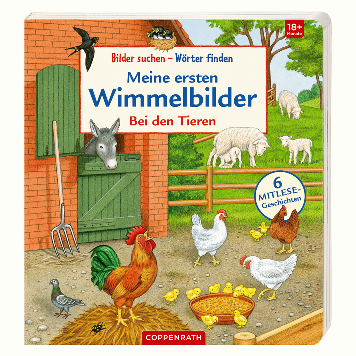 Der kleine Welpe tobt über die Wiese. Der Flamingo steht auf einem Bein. Das Eichhörnchen sammelt schon den Vorrat für den Winter. Aber was macht das Nashorn? Hier gibt es einiges zu entdecken! Ganzseitige Wimmelbilder und einfache Mitlesegeschichten laden schon die Kleinsten zum Suchen und Mitsprechen ein. Erkennen – benennen – immer wieder Anschauen!