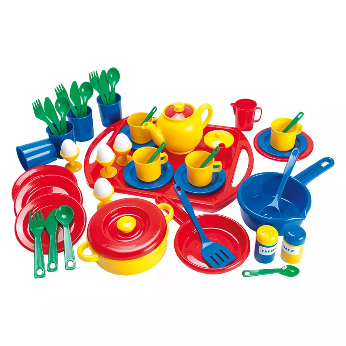 Dieses bunte, 57-teilige Geschirrset ist für Kinder ab 3 Jahren geeignet und besteht aus 4 Esslöffeln, 4 Gabeln, 4 Messern, 5 Teelöffeln, 4 Eier-Bechern, 4 Eiern, 4 Bechern, 4 Tellern, 4 Untertassen, 4 Tassen, 1 Zuckerdose, 1 Deckel zur Zuckerdose, 1 Sahnekännchen, 1 Teekanne, 1 Deckel zur Teekanne, 1 Pfanne, 2 Töpfen, 1 Deckel zum Topf, 1 Spachtel, 1 Löffel, 1 Salzdose, 1 Deckel zur Salzdose, 1 Pfefferdose, 1 Deckel zur Pfefferdose sowie 1 Tablett.