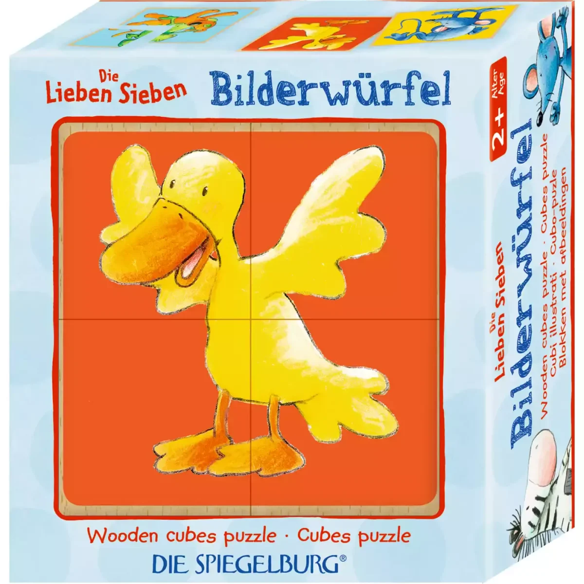 Puzzlespaß mit den Lieben Sieben: Aus einem Set von 4 Würfeln entstehen durch das richtige Drehen und Zusammenlegen 6 Motive mit den Lieben Sieben. Wer kann die Bildmotive aus Buchenholz richtig zusammensetzen?