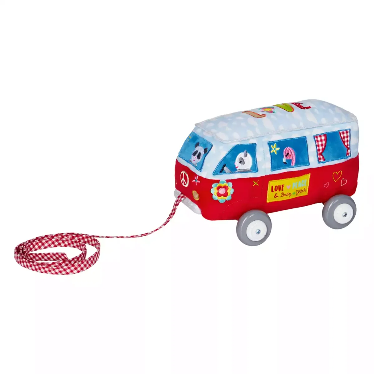 Der Hippie-Bus aus kuschelweichem Plüsch ist ein farbenfroher Hingucker, ausgeschmückt mit liebevollen Details. Die Holzräder sowie die Vichy-Leine machen den Wagen flink und laden gleichzeitig zum Erkunden ein.