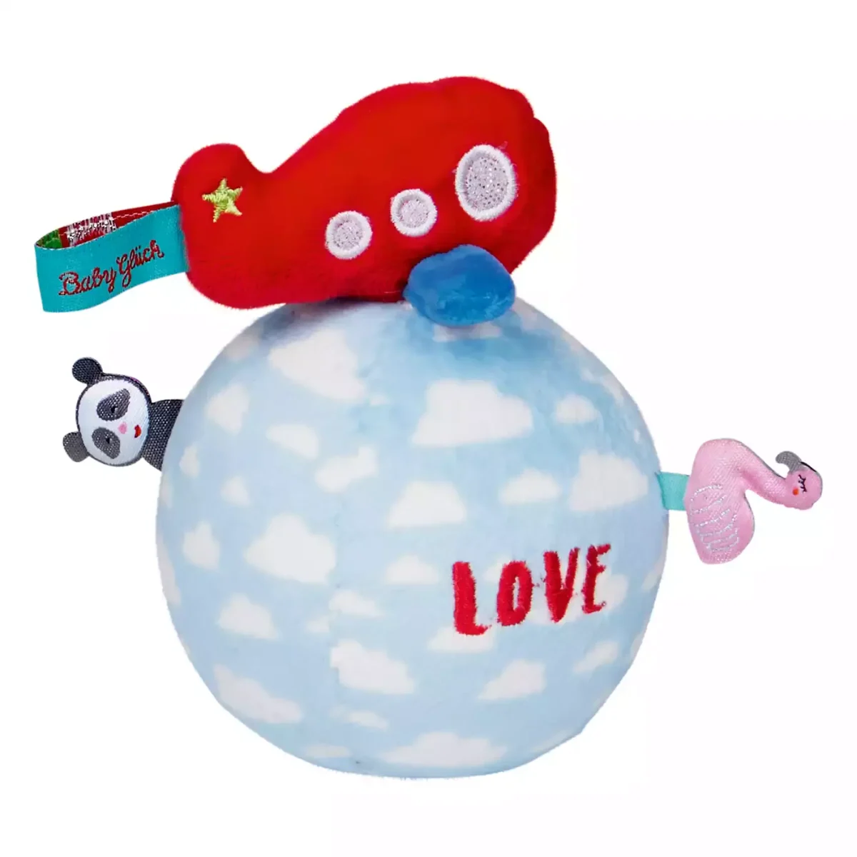 Wird das „Mini Steh-auf-Flugzeug“ aus der Serie BabyGlück angestupst, so erklingt ein lustiges Glockenspiel während es hin und her wackelt. Geschmückt ist das Flugzeug mit leuchtenden Farben, Applikationen und Stickerei.