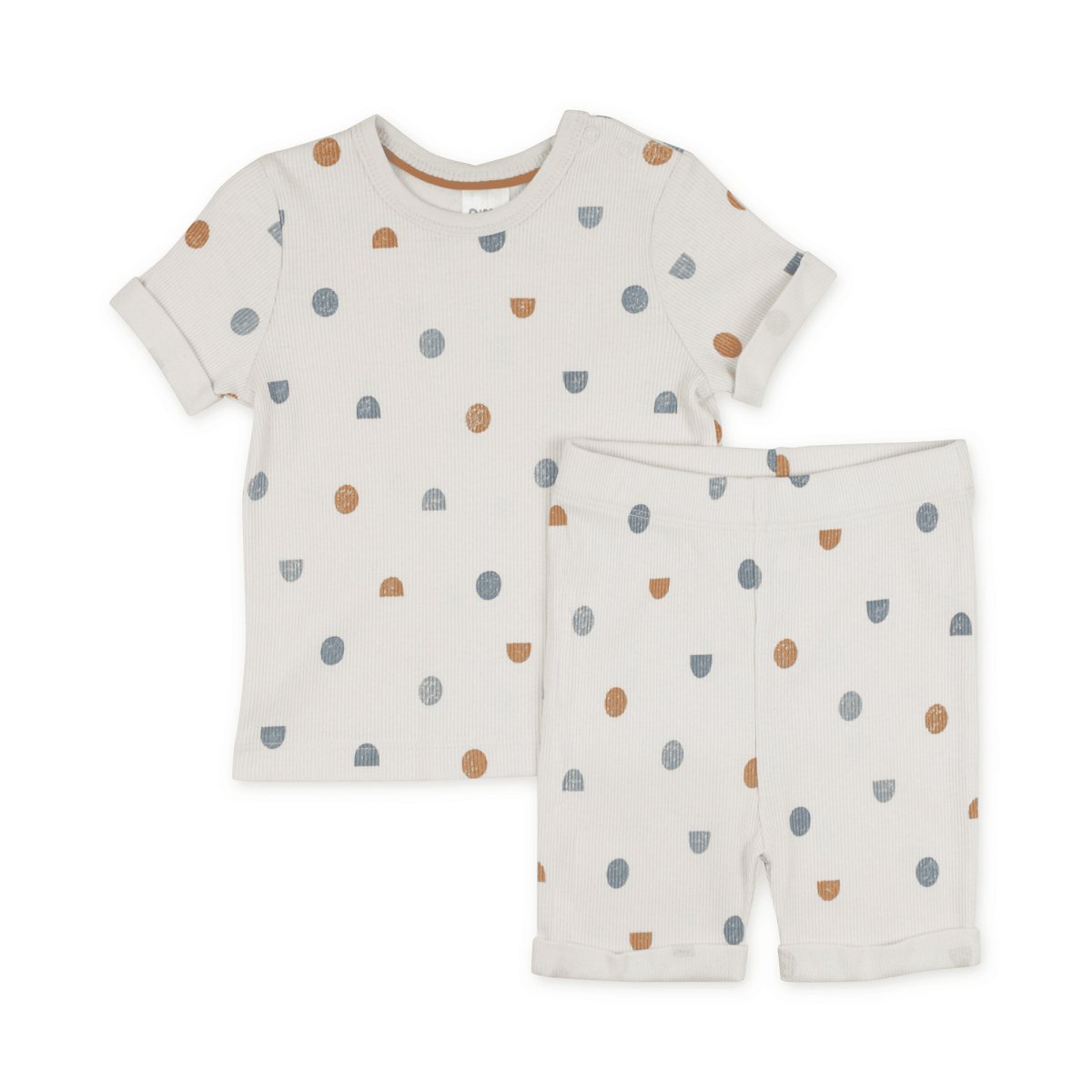 Der Zweiteiler Konfetti von DIMO besteht aus einem Kurzarmshirt und einer passenden Shorts aus 100% Bio-Baumwolle. Das farbenfrohe Konfetti-Muster verleiht dem Set einen verspielten Look, während praktische Druckknöpfe am Halsausschnitt das Anziehen erleichtern – ideal für warme Tage.