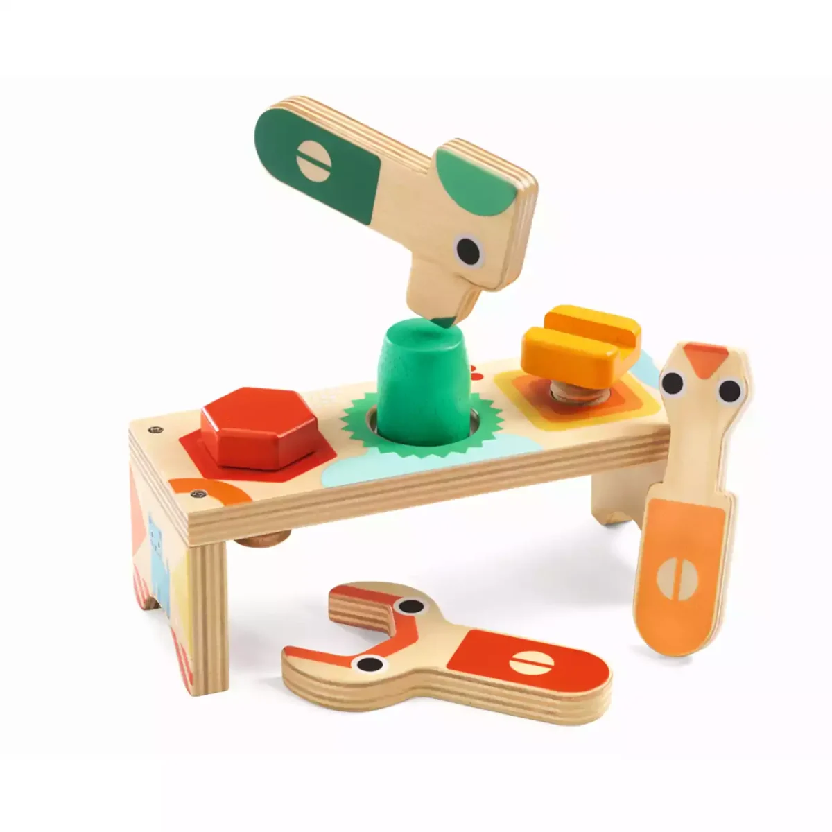 Die wunderschöne Werkbank Bricolou von Djeco sorgt jederzeit für einen großen Spaß. Mit den drei verschiedenen Werkzeugen kann dein kleiner Schatz durch Drehen und Klopfen an der Werkbank spielen. Die Motorik deines Kindes wird nebenbei spielerisch gefördert. Bricolou besteht aus hochwertigem Holz und ist ab einem Alter von ca. 18 Monaten geeignet.