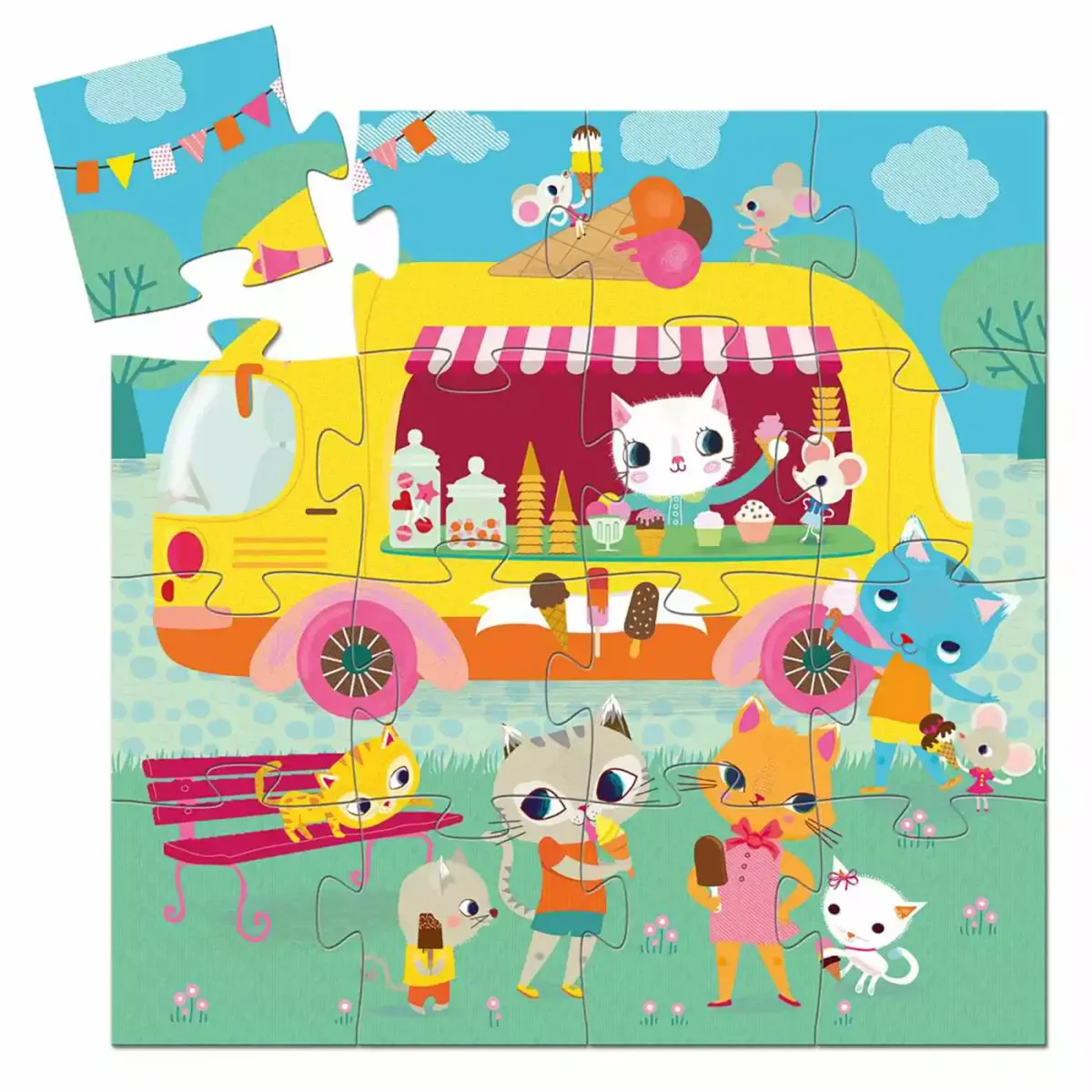 Das Kinderpuzzle Ice cream truck von Djeco besteht aus 16 Teilen und zeigt einen kunterbunten Eiswagen und niedliche Katzen. Während dem Puzzlen werden die Auge-Hand-Koordination und die Motorik gefördert. Eine wunderschöne Box für die Puzzleteile, mit einem beweglichen Detail, ist inklusive. Das Puzzle ist ab ca. 3 Jahren geeignet.