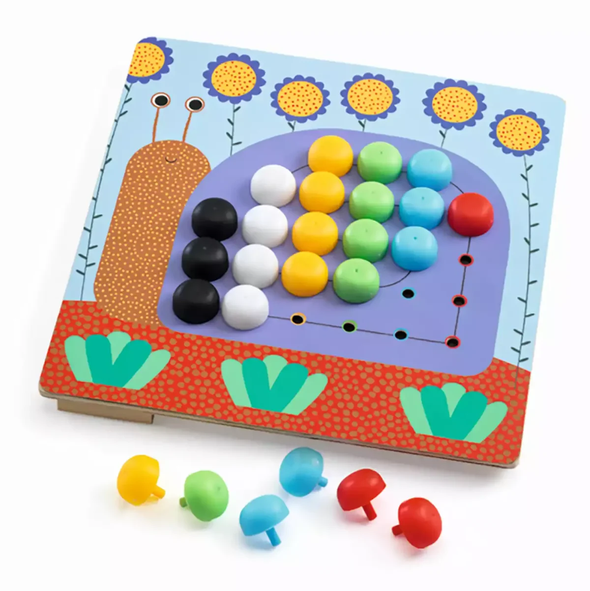 Das wunderschöne Lernspiel Primo Mosaico von Djeco fördert spielerisch die Feinmotorik deines Kindes. Eine von den acht Karten aus Pappe wird auf das Holzbrett befestigt und dadurch kann sich dein kleiner Schatz beim Stecken der Einzelteile einfach an der farbigen Vorlage orientieren. Primo Mosaico ist ab einem Alter von ca. 3 Jahren geeignet.