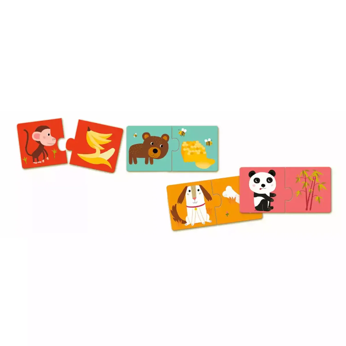Das Puzzle Duo von DJECO besteht aus insgesamt 10 Puzzle mit je 20 Teilen. Findest du das Lieblingsessen der abgebildeten Tiere? Das Puzzle ist für Kinder ab 2 Jahren geeignet. Es fördert spielerisch die Feinmotorik.