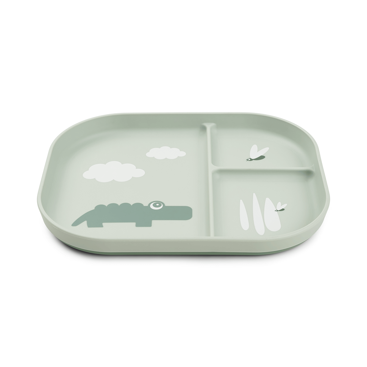 Die Fachplatte in Grün ist mit einem coolen Motiv von Croco, dem Krokodil, bedruckt, das ein paar Glühwürmchen anstarrt. Die Neugier von Croco wird Ihr Kind dazu inspirieren, das Essen auf dem Teller zu erkunden.