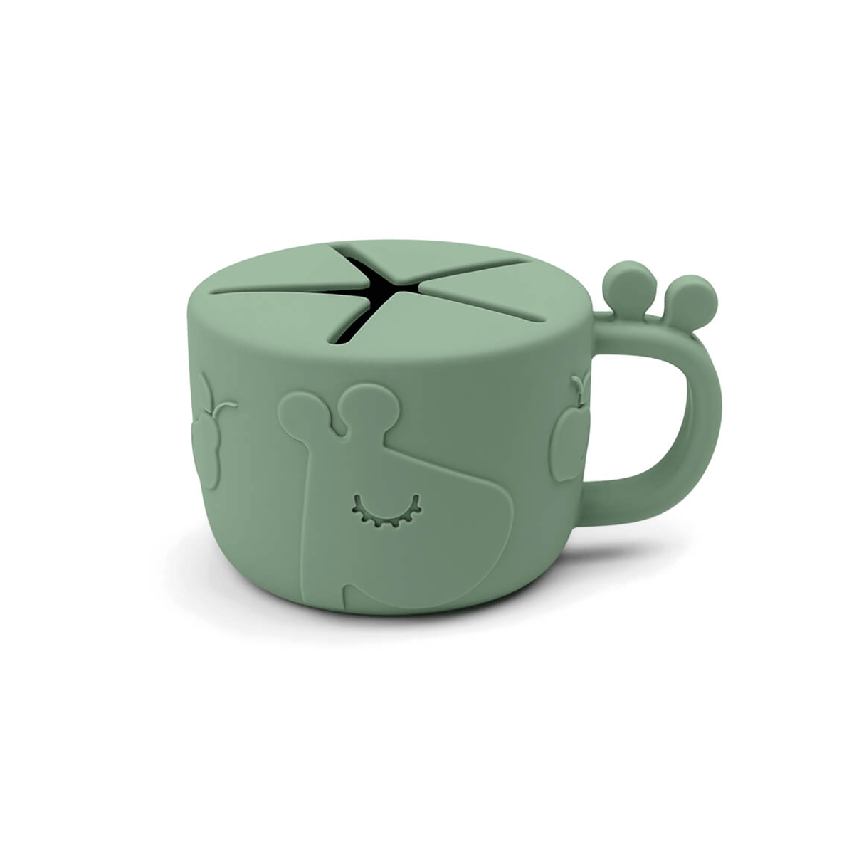 Raffi und die niedlichen kleinen Früchte springen aus dem auslaufsicheren Becher. Der Snackbecher besteht aus lebensmittelechtem Silikon, ist bruchsicher und besitzt griffige Eigenschaften.