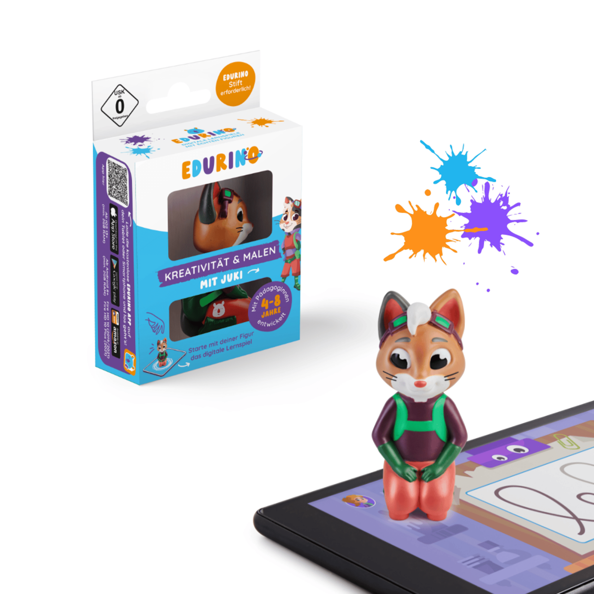 Mit der Lernfigur Juki von Edurino kann dein Nachwuchs ab ca. 4 Jahren spielerisch in die Welt der Kreativität eintauchen! Gemeinsam mit Katze Juki begibt sich dein Kind auf spannende Abenteuer – es malt, bastelt, erfindet und kreiert sogar ein eigenes Theaterstück! So werden kindgerecht Grundkompetenzen im Bereich im Bereich der Farbenlehre und Malexperimente vermittelt. Abwechslungsreiche Missionen motivieren es zu Vorschul- und Schwungübungen, die gemeinsam mit Pädagogen und Experten entwickelt wurden. Weitere Lerninhalte sind das Entwerfen eigener Kostüme, Figuren und Bühnenbilder sowie strukturiertes Gestalten.