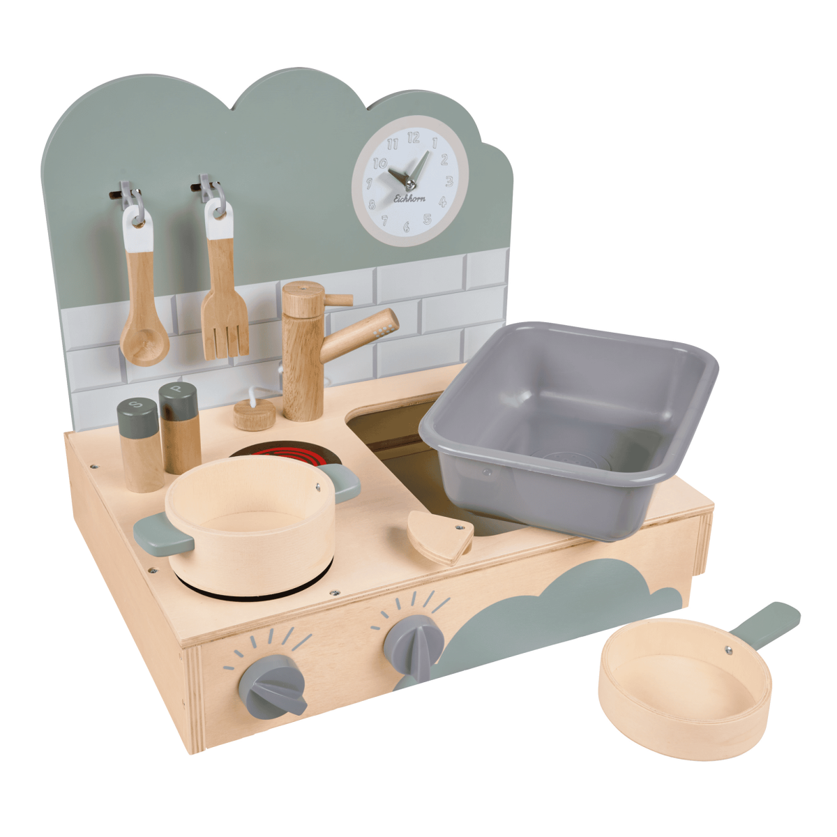 Die Eichhorn Tischküche ist der ideale Begleiter für dein Kind, um die kulinarische Welt zu entdecken! Diese kompakte Tischküche bietet ein Kochfeld mit realistischem Sound und drehbaren Knöpfen, die lustige Geräusche verursachen. Dein kleiner Nachwuchskoch oder Nachwuchsköchin kann sich an einer Pfanne und einem Topf ausprobieren, das Spülbecken mit Wasserhahn erkunden und mit dem Kochlöffel sowie dem Pfannenwender meisterhafte Gerichte zaubern. Salz- und Pfefferstreuer sorgen für den letzten Schliff, während die verstellbare Uhr die Zeit im Auge behält. Mit einer Größe von ca. 40 x 35 x 31 cm ist diese Spielküche perfekt auf die Bedürfnisse von Kindern ab ca. drei Jahren abgestimmt.