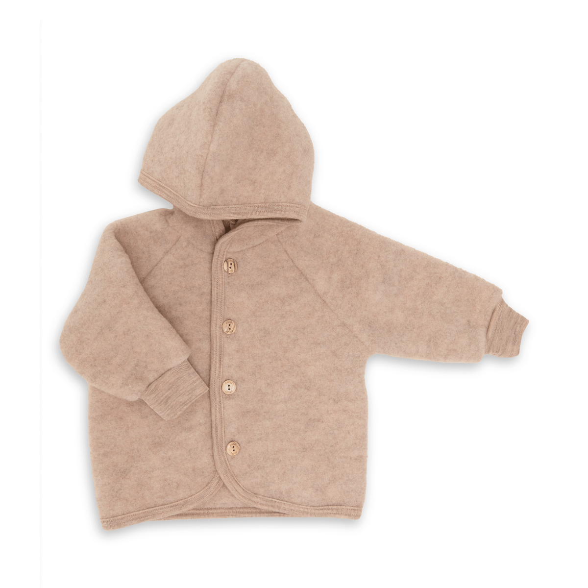 Die kuschelweiche Fleece Baby-Kapuzenjacke von ENGEL besteht zu 100% aus Schurwolle aus kontrolliert biologischer Tierhaltung. Die Wolle ist anschmiegsam weich und hält mollig warm. Dank der vier naturfarbenen Holzknöpfe geht das An- und Ausziehen schnell und kinderleicht.