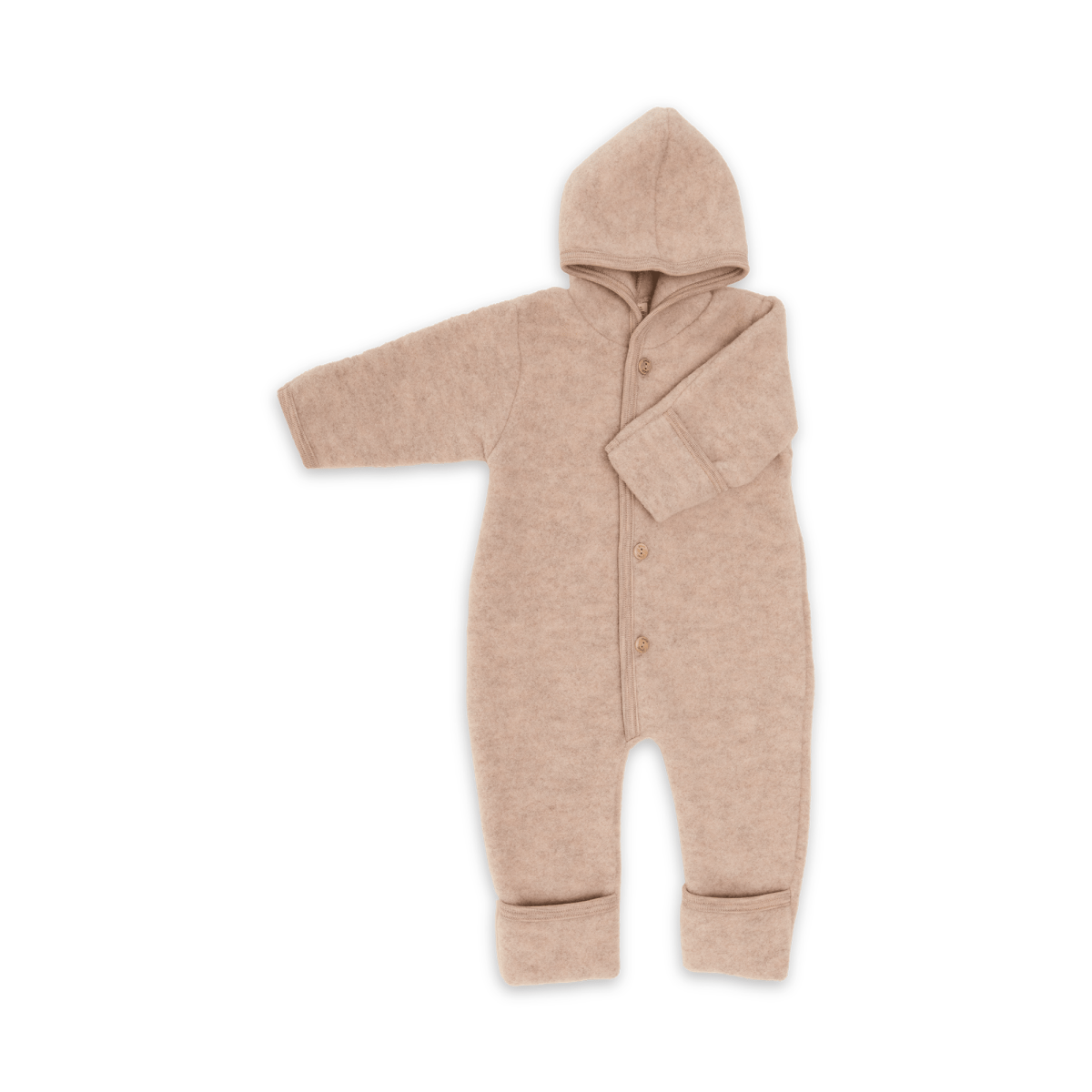 Der kuschelweiche Fleece Baby-Overall von ENGEL besteht zu 100% aus Schurwolle aus kontrolliert biologischer Tierhaltung. Die Wolle ist anschmiegsam weich und hält an kalten Tagen mollig warm. Dank der vier naturfarbenen Holzknöpfe geht das An- und Ausziehen des Walkoveralls schnell und kinderleicht. Zusätzlich besitzt der Overall praktische Umschläge zum Verschließen an den Armen und Beinen.