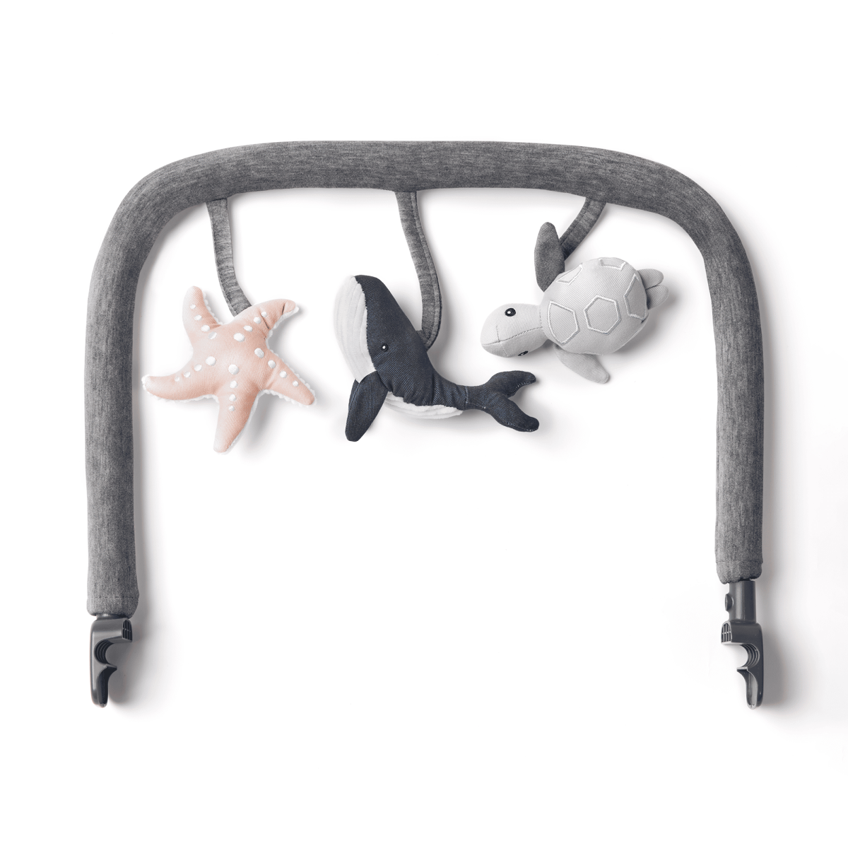 Doch damit sich dein Liebling an den kleinen Unterwasserfreunden erfreuen kann, benötigt der Spielbogen ein passendes ‚Schiff‘. Hier nimmt ERGObaby den Evolve 3-in-1 Bouncer ins Visier. Der Bogen lässt sich kinderleicht an der Wippe anbringen. Damit die Wippe an dem Spielbogen nicht hochgehoben werden kann, löst sie sich auch ganz einfach wieder von dem Bouncer.