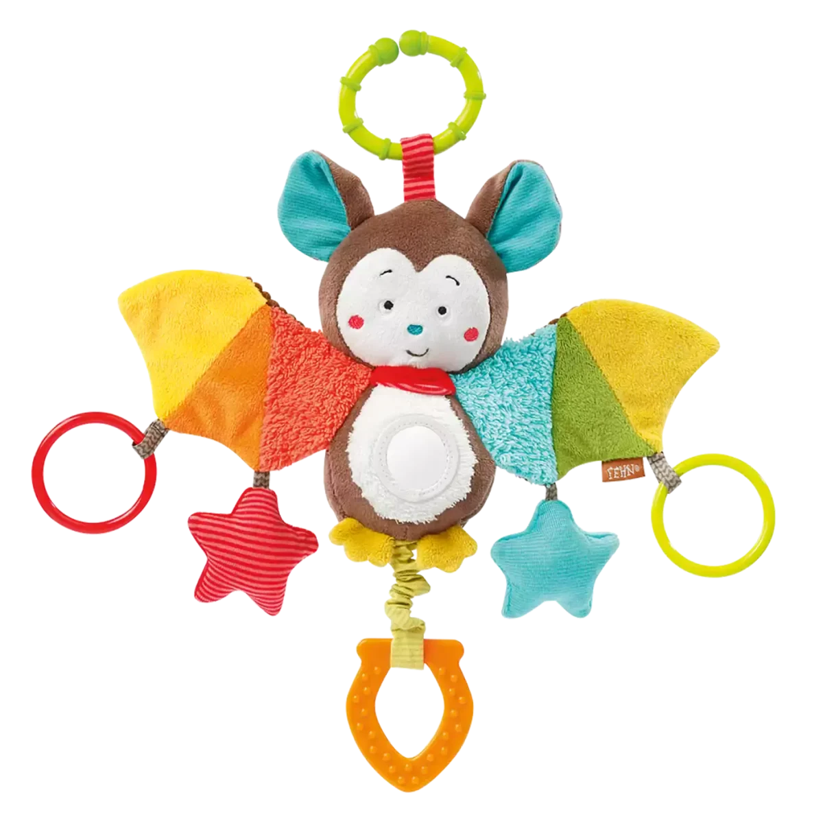 Die süße Activity-Fledermaus aus der Kollektion Jungle Heroes bezaubert das Baby mit ihrem freundlichen Gesicht und sorgt für gute Laune zuhause und unterwegs. Die bunten Flügel laden mit verschiedenen Materialien und Raschelpapier zum Fühlen und Greifen ein. Ein Stern mit Quietsche, ein weiterer Stern mit Rassel und die beiden Greifringe, regen die Neugier des Babys an und fördern den Greif- und Tastsinn sowie die Feinmotorik. Der zentral positionierte Spiegel trägt positiv zur Entwicklung der Ich-Wahrnehmung des Babys bei. Der Softbeißer mit Noppenstruktur hilft beim Zahnen und lässt die Fledermaus lustig vibrieren, wenn Ihr Baby daran zieht. Dank des flexiblen C-Rings am Kopf der Fledermaus, kann diese ganz einfach an Bettchen, Kinderwagen und Babyschale befestigt werden und wird so schnell zum treuen Begleiter des Babys.