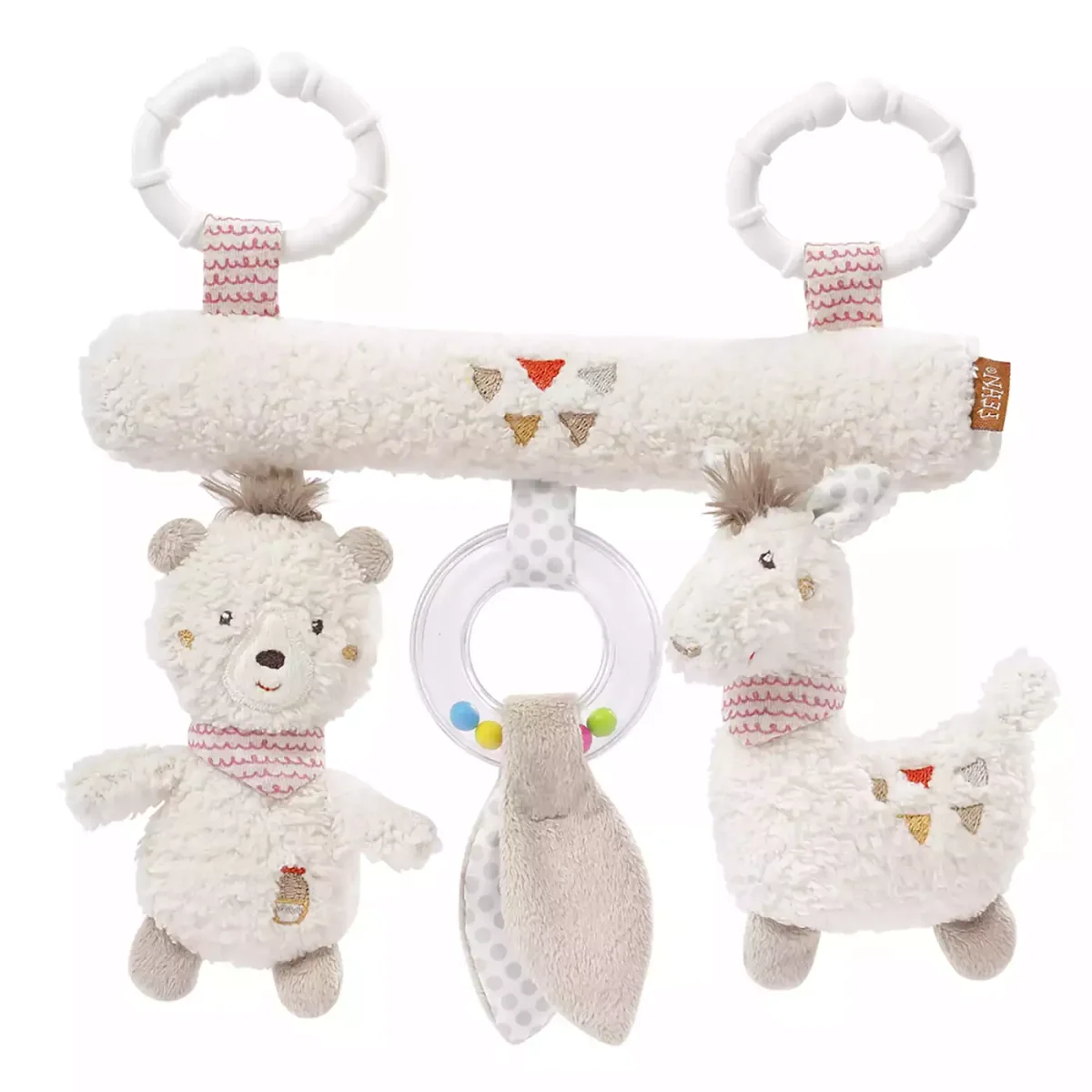 Das spaßige Activity Trapez Peru von fehn ist mit Tier-Anhängern ausgestattet. Diese Tier-Anhänger besitzen unterschiedlichste Funktionen wie zum Beispiel die Tierstimme im Lama, das Raschelpapier in den Blättern und die Quietsche im Bär. Alle samt sind aus kuscheligen Materialien angefertigt. Die Geräusche wecken Babys Neugier und laden zum Greifen und Fühlen ein. Das stärkt nicht nur die Greif- und Tastsinn und die Feinmotorik sondern fördert auch die Hand-Auge-Koordination. Für unterwegs oder zu Hause lässt sich das Trapez schnell an Babyschale, Kinderwagen, Bettchen oder Laufgitter befestigen. Das fehn Activity Trapez Peru wurde von unabhängigen Testinstituten auf Sicherheit geprüft und eignet sich für Kinder ab der Geburt somit ist es ideal als Geschenk zur Geburt, Taufe oder als Geburtstagsgeschenk.