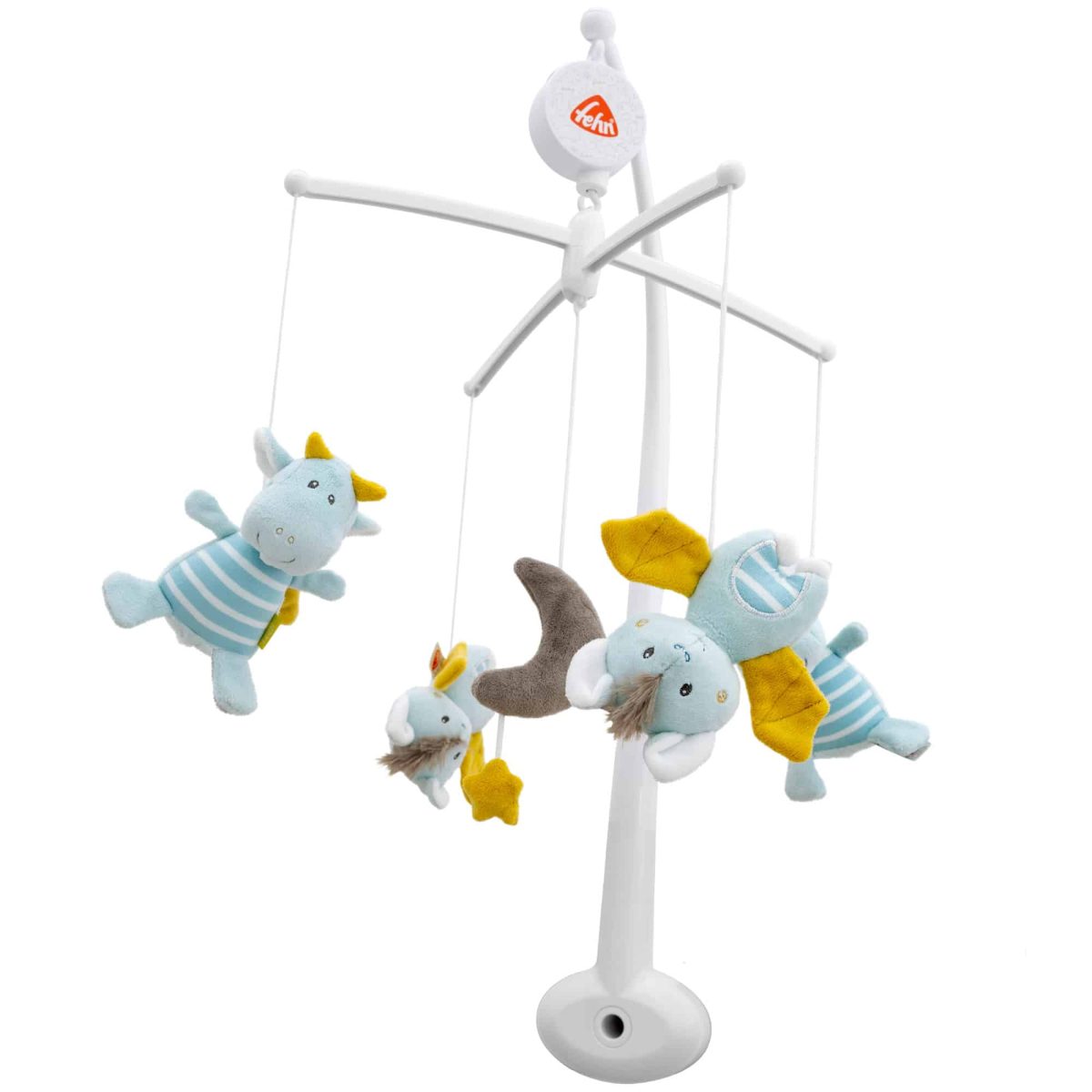 Nächte sind zum Träumen da! Das Musik-Mobile aus der Little Castle Kollektion wird das Herz Ihres Babys im Nu erobern. Der furchtlose Drache und die freche Fledermaus machen das kleine Schloss unsicher und nehmen Ihr Baby mit auf seine Reise ins Land der Träume. Die mechanische Spieluhr mit An-/Ausschalter lässt die Figuren tanzen und wiegt Ihr Baby mit einer beliebten Schlafliedmelodie sanft in den Schlaf. Tagsüber wecken die tanzenden Drachen und Fledermäuse Babys Neugier und laden zum Lauschen, Beobachten und Staunen ein. Sanfte Farben und abwechslungsreiche Formen regen Babys Wahrnehmung an. Zum Spielen und Waschen lassen sich die Figuren ganz leicht abnehmen. Das Mobilegestänge im zeitlosen Design erlaubt eine einfache Befestigung. So wird das Musik-Mobile Little Castle schnell unentbehrlich am Bett Ihres Schatzes.