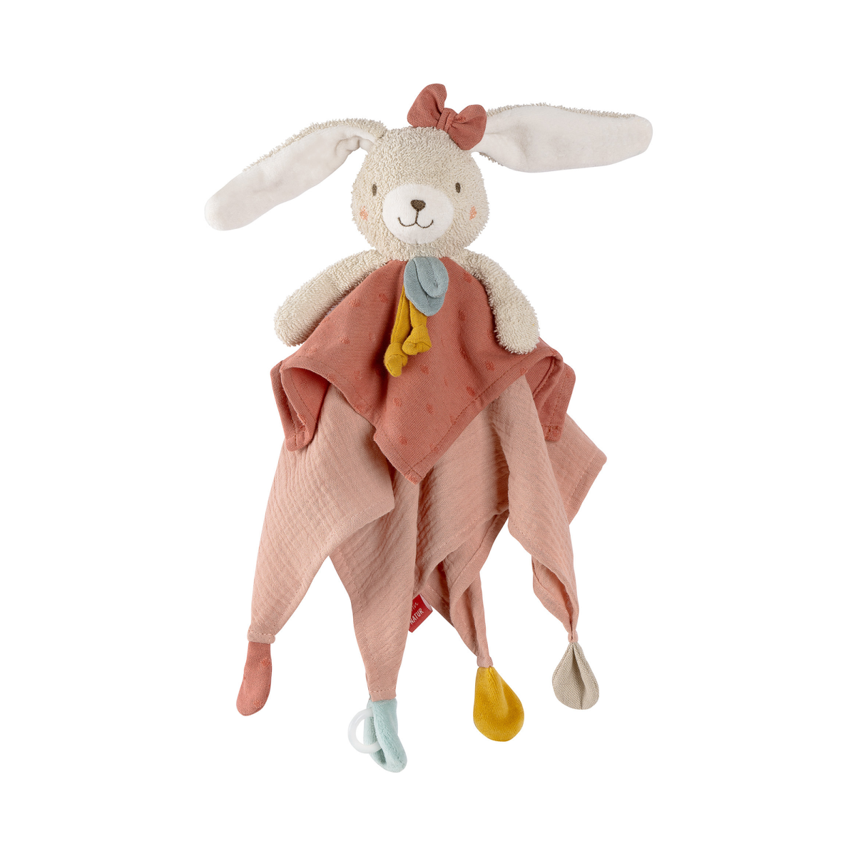 Dieses zuckersüße Schmusetuch Hase aus der fehnNATUR® Kollektion ist Spielkamerad und Stofftier-Schnuffeltuch in einem. Dient aber auch wunderbar als Tröster, Einschlafhelfer sowie Kuschelfreund und ist dabei Babys treuer Begleiter zuhause oder auf Reisen. Der praktische Schnullerring am Stofftier-Hasen sorgt zudem dafür, dass Babys Schnuller nicht verloren geht.