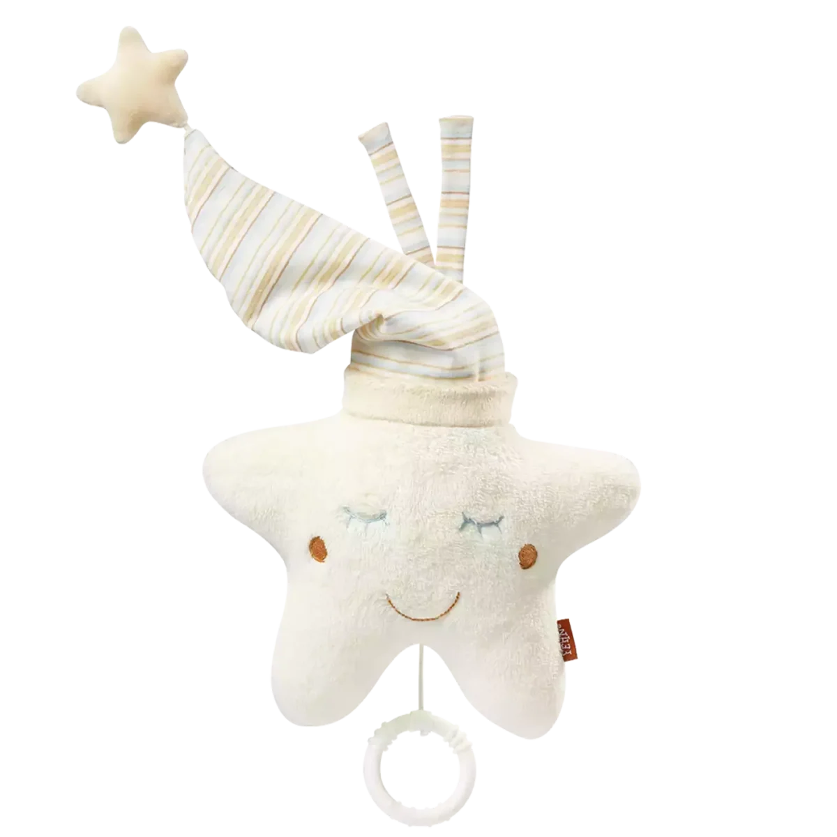 Die Spieluhr Stern aus der Kollektion BabyLOVE wird das Herz deines Babys im Nu erobern. Besonders weiche Materialien und dezente Beigetöne laden zum Fühlen, Knuddeln und Liebhaben ein. Einfach aufziehen, eine beliebte Melodie erklingt und dein Baby wird beruhigt, getröstet und sanft in den Schlaf gewogen. Das Spielwerk kann durch Öffnen des Sicherheitsreißverschlusses zum Waschen entnommen werden. Der traumhafte Stern wird mit zwei Bändern ganz einfach an Bettchen, Kinderwagen, Laufgitter und Babyschale befestigt. Mit seinem schlafenden Gesicht und der hübschen Mütze mit Sternanhänger ist er zuhause und auch unterwegs ein echter Hingucker und wird schnell zum besten Freund deines Babys.