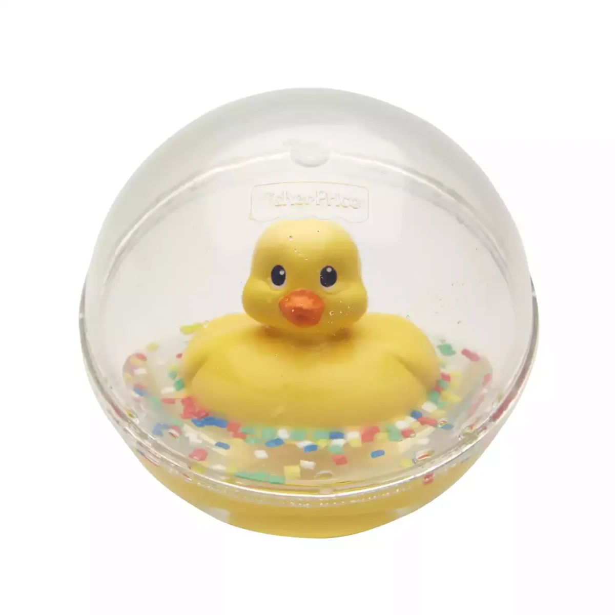Eine fröhliche gelbe Ente, die in einer großen, durchsichtigen Kugel aus Kunststoff schwimmt und für tolle Spielmöglichkeiten vom Baby- bis ins Kleinkindalter sorgt. Kleinere Kinder animiert sie zum Anstupsen und Rollen. Größere Kinder werden der Kugel begeistert hinterherkrabbeln. Zum Greifen passt die Kugel perfekt in kleine Kinderhände. In ihrem Inneren wirbelt Konfetti herum, das zum Schütteln einlädt.
