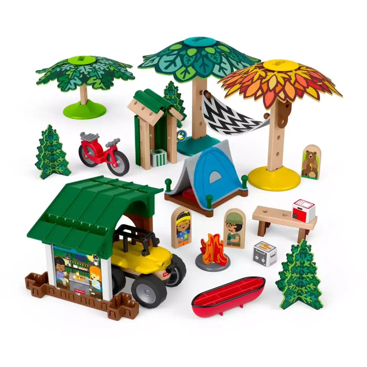 Mit dem Wunder Werker Campingplatz Bausatz können Kinder den Campingplatz ihrer Träume gestalten und ihn mit Schatten spendenden Bäumen, einer gemütlichen Hängematte, einer Kanufahrt, einem Lagerfeuer zum Rösten von Marshmallows und mehr komplettieren!