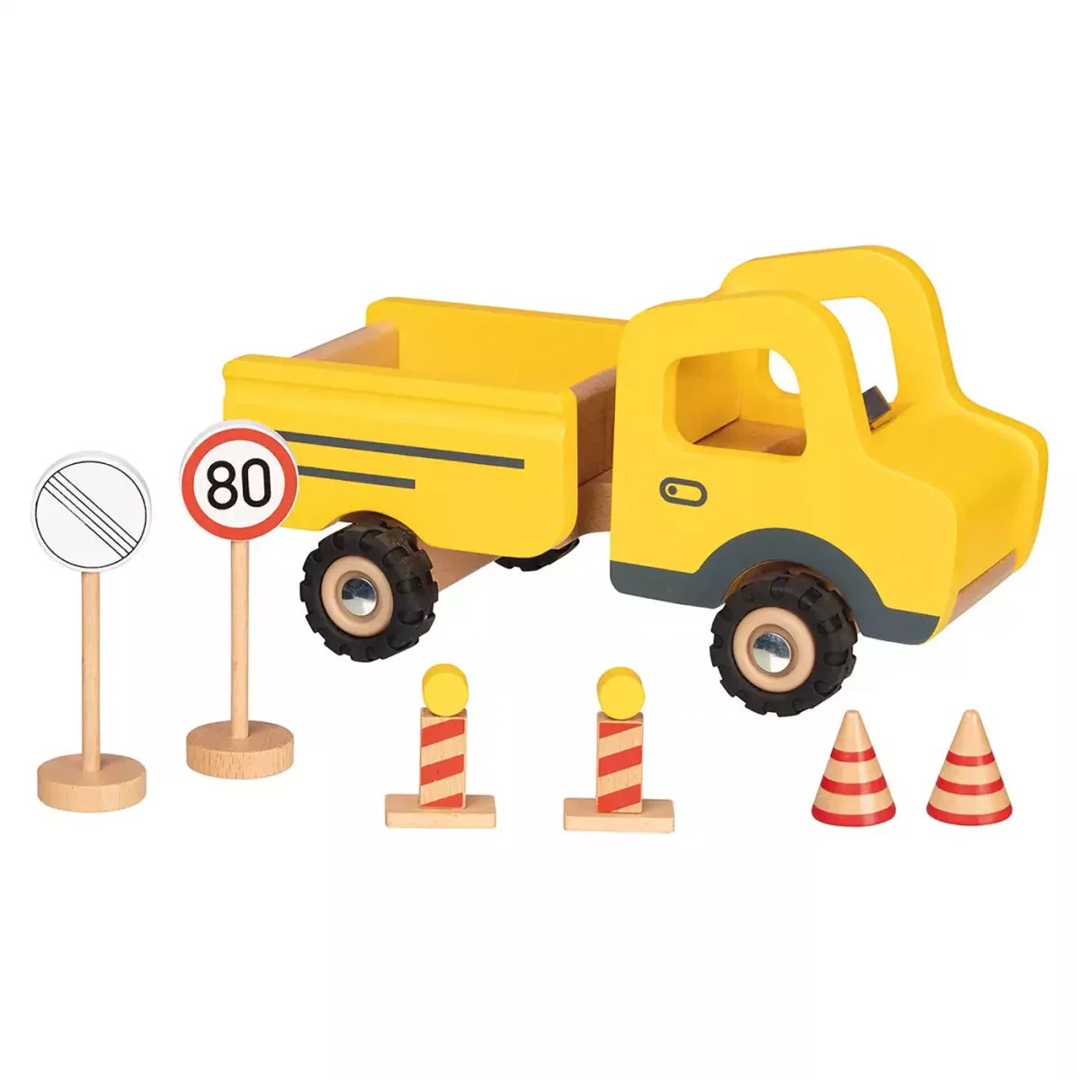 Ein Holzauto, gemacht für den täglichen Einsatz auf der Straße. Als robustes Baustellenfahrzeug, ausgerüstet mit dem notwendigen Zubehör für die kleinen Ausbesserungen des Straßenbelages. Die speziell für Kinderhände konzipierten, formschönen, offenen Seitenteile und eine hochwertige Gummibereifung erhöhen die Bespielbarkeit.