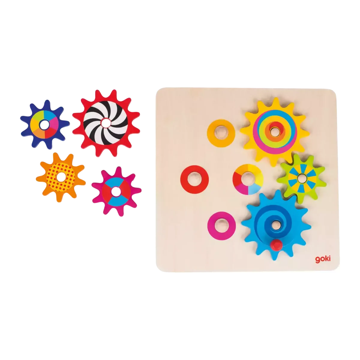 Es macht einen riesengroßen Spaß, die bunten Holzzahnräder auf dem Tableau zusammen zu stellen. Passt alles? Drehen sich alle Zahnräder, sobald das große blaue Zahnrad bewegt wird? Erst dann hat man mit Erfolg gespielt!