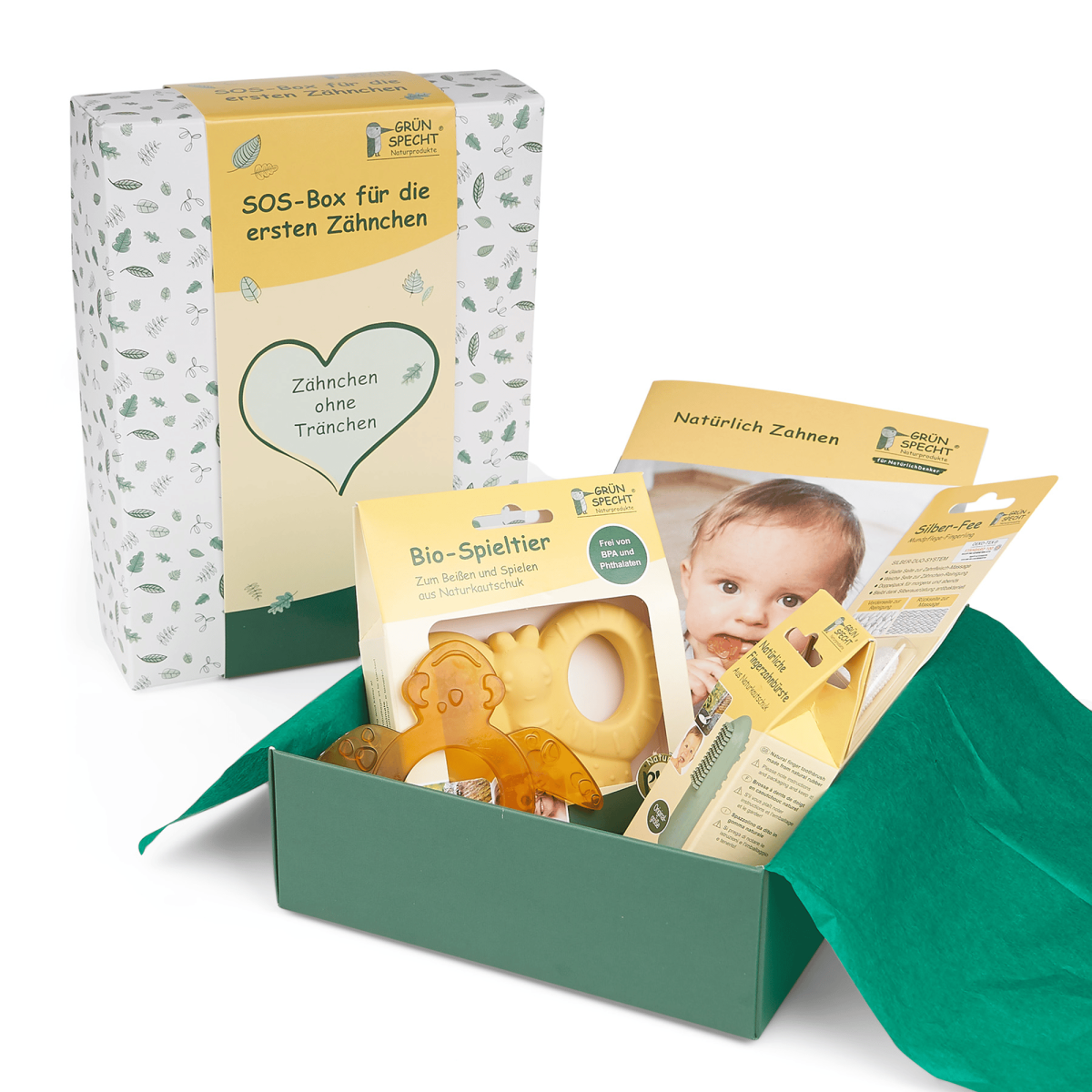 Die SOS-Box zum Zahnen von GRÜN SPECHT besteht aus einem Mundpflege-Fingerling „Silber Fee“, einem Bio-Beißring Schildkröte, einem Bio-Spieltier Schmetterling, einer natürlichen Fingerzahnbürste, einer Infobroschüre und einer Box in der sich alle Produkte befinden.