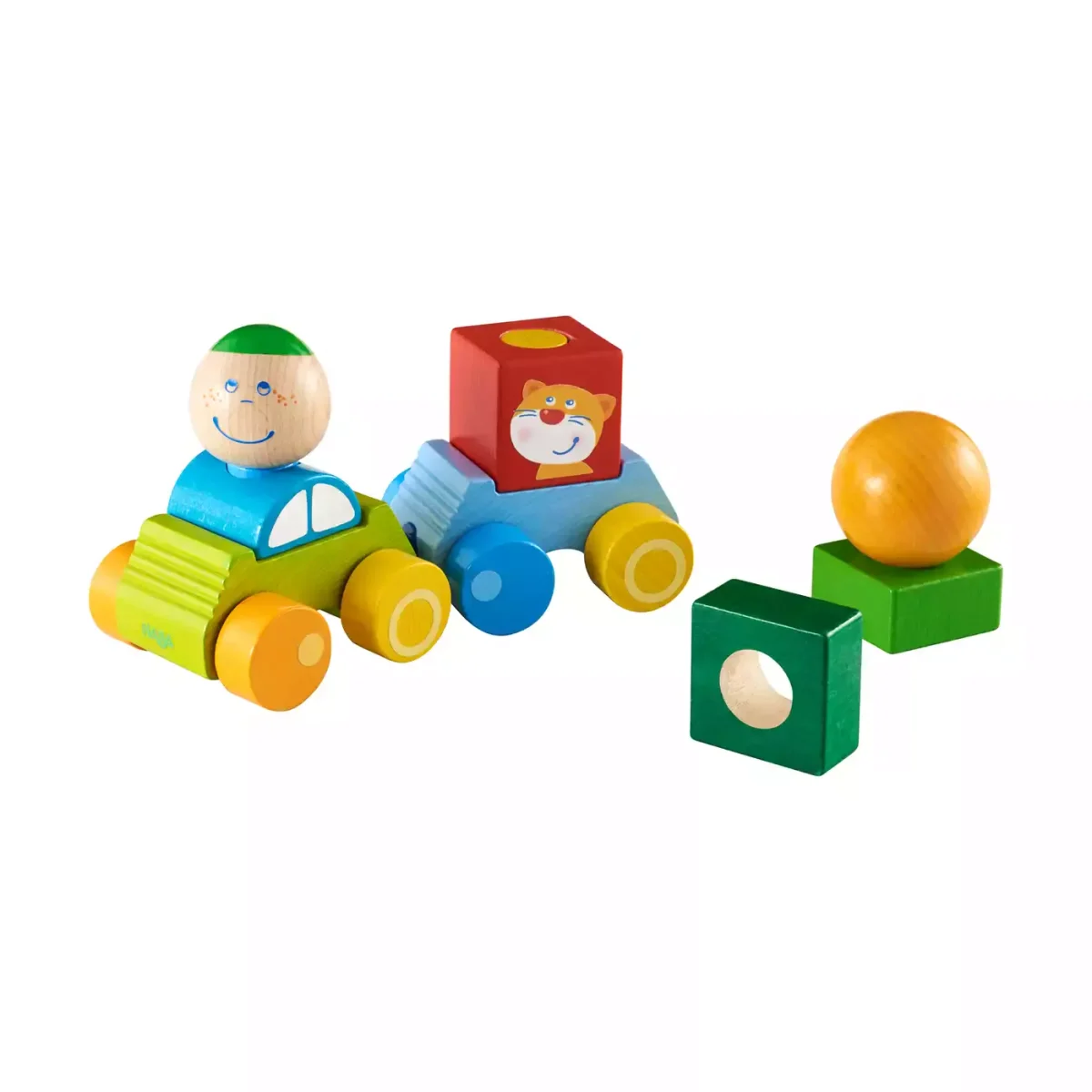 Mit dem bunten Entdeckerauto Anton von Haba können kleine Abenteurer die Welt um sich herum erkunden. Das farbenfrohe Auto mit Anhänger ist ein vielseitiges Holzspielzeug, das zum Bauen, Stecken, Fahren und Entdecken anregt. Die beiden Holzautos lassen sich dank praktischer Kupplung einfach verbinden und Steckfigur Paul aus Kugel und Rundstab kann immer wieder in seinen kleinen Wagen gesetzt oder herausgenommen werden. Dank Steckvorrichtung können auch im zweiten Wagen kleine Bausteine als wertvolle Fracht transportiert werden. Der rote Würfel mit Katzenmotiv und die kleine Holzkugel bringen zusätzlich Farbe und Spaß ins Spiel.