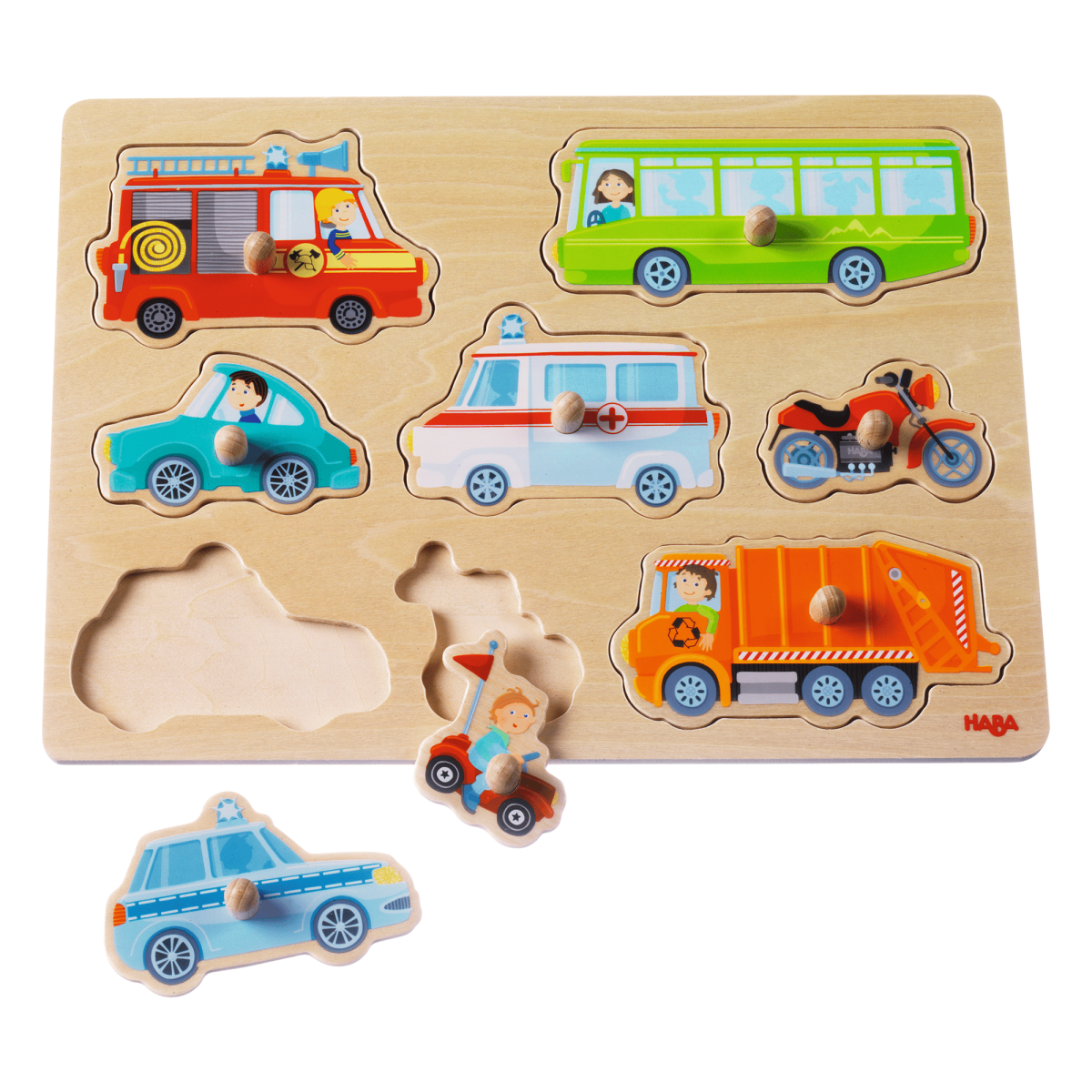 Die fröhlichen Fahrzeuge laden zum Erkennen und Benennen ein, während sie sich mühelos in die Holzform einfügen. Jedes Teil erzählt eine eigene kleine Geschichte, die die Fantasie deines Kindes beflügelt. Dieses Greifpuzzle bietet den ersten aufregenden Puzzlespaß und begleitet es auf seiner Entdeckungsreise durch die spannende Welt der Formen und Farben!