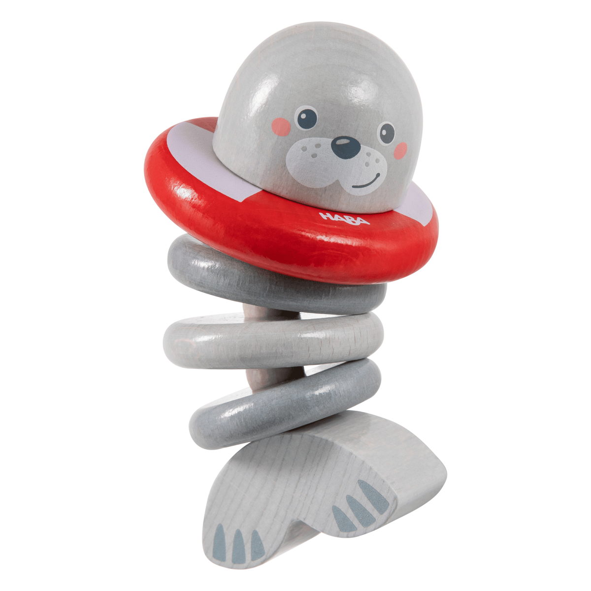 Die niedliche HABA Klapperfigur Robbe ist bereit, deinen Nachwuchs auf eine aufregende Entdeckungsreise mitzunehmen. Gefertigt aus herrlich glattem und robustem Buchenholz, hält sie allen Abenteuern stand und begleitet dein Kind mit einem sanften Klang durch die ersten Jahre. Mit einem reißfesten Gummiband und einem knallroten Schwimmreifen versehen, lädt sie zum Greifen, Schütteln und lustigem Klappern ein, was die Sinne deines kleinen Entdeckers spielerisch stimuliert. Ahoi, kleine Robbe!
