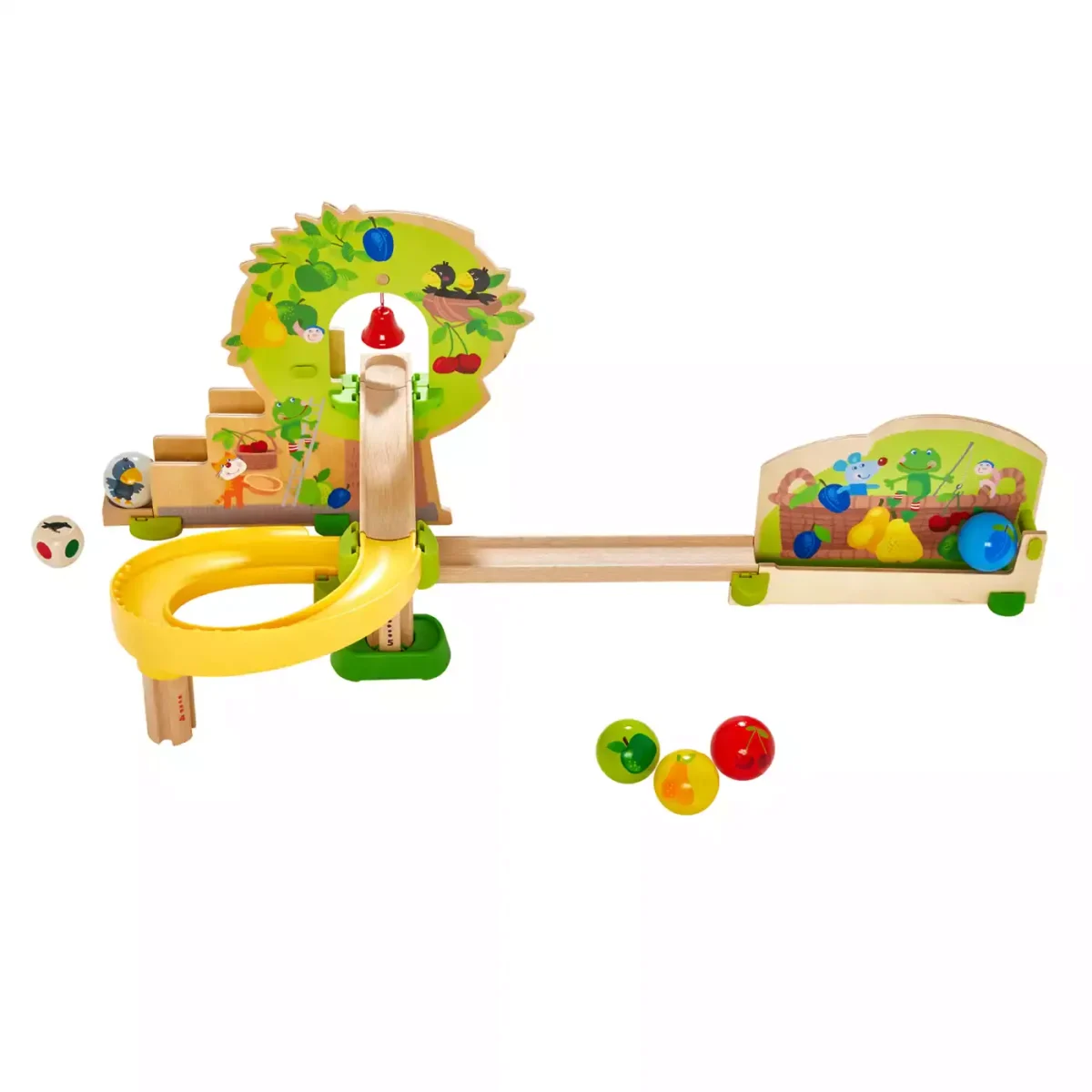 Ganz oben im Baum liegen die wunderschönen Früchte-Kugeln bereit. Ein kleiner Schubs genügt und die Kugeln kullern durch das Glöckchentor und die Spiralkurve entlang. Schon sind die Früchte fertig für die Ernte. Doch was ist das? Der diebische Rabe nimmt die Verfolgung der Vitaminbomben auf! Kann dein Kind ihm zuvorkommen und sich das Obst schnappen?