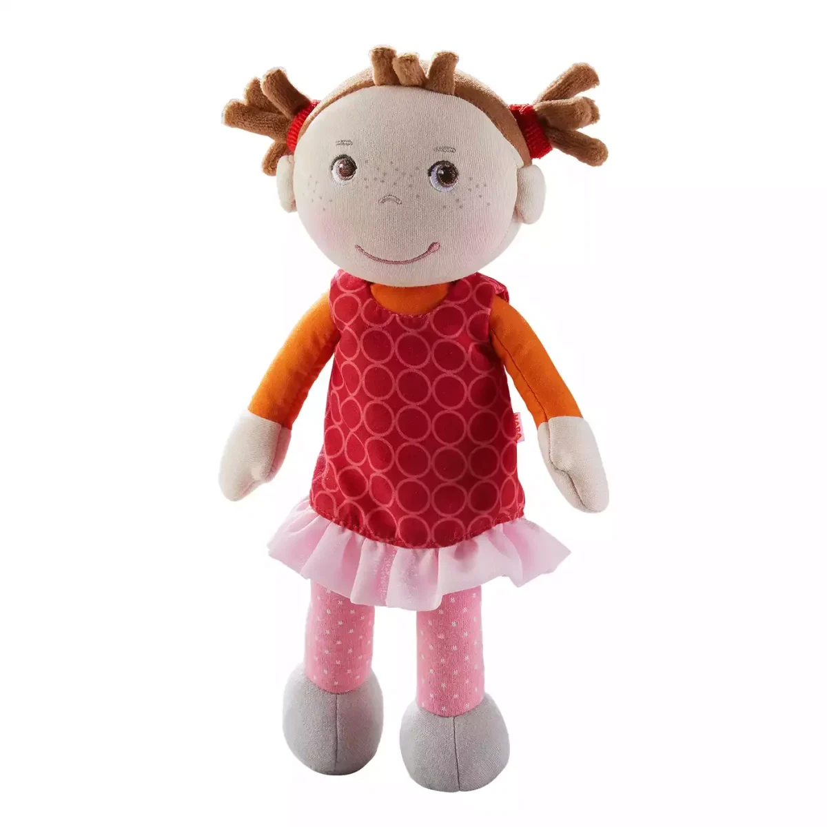 Wer möchte kuscheln? Die süße Kuschelpuppe Mirka von Haba lädt Babys und Kleinkinder zum Spielen, Schmusen und Liebhaben ein. Der Körper der Puppe hat eine weiche Füllung und einen kuscheligen Stoff. Die Haba Kuschelpuppe ist daher auch prima zum trösten geeignet. Mit ihrem fröhlichen Gesichtsausdruck, den zwei Zöpfen und ihrer farbenfrohen Bekleidung sieht sie so süß aus, dass man sie gerne in die Arme nimmt und sie an sich drückt.
