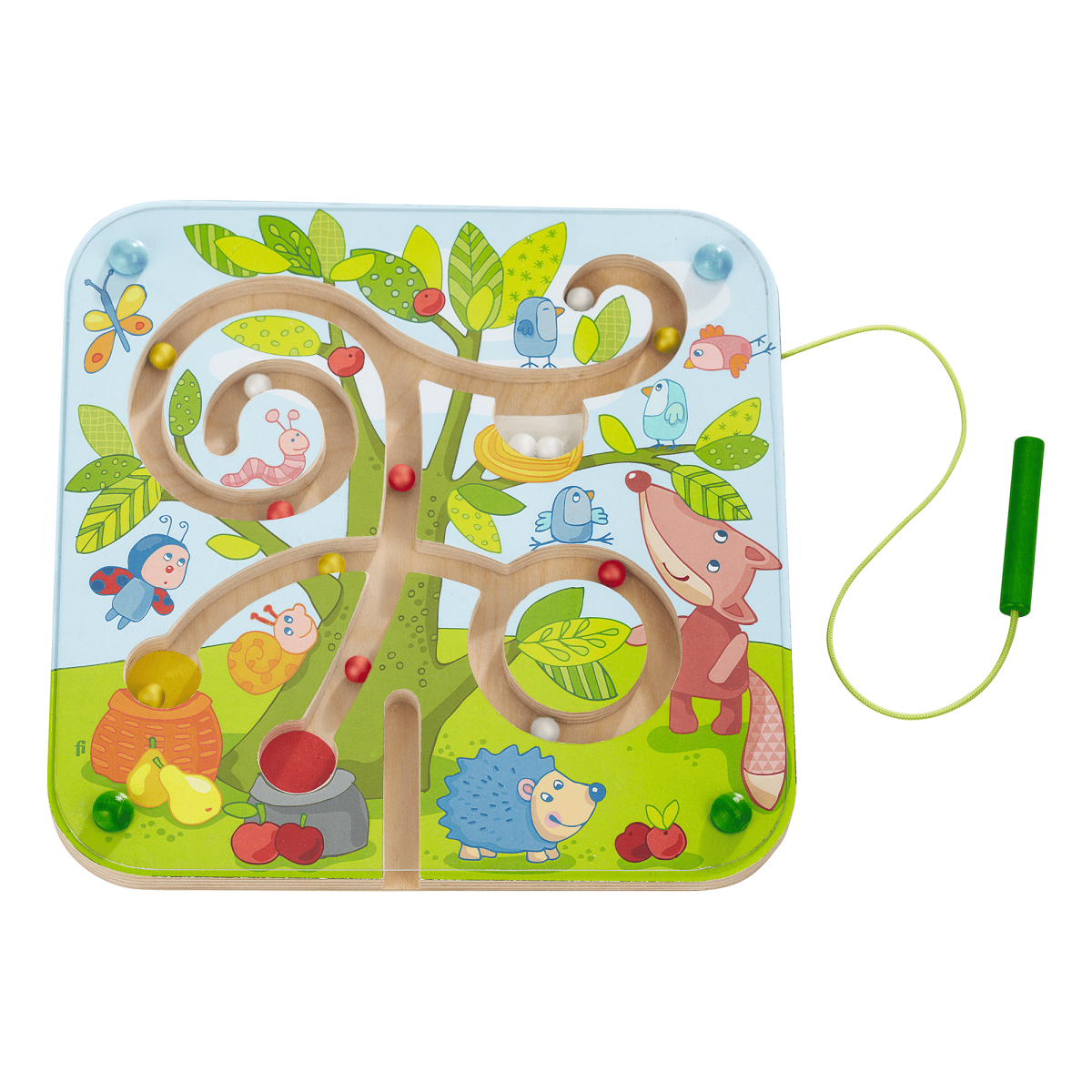 Das kunterbunte Magnetspiel Baumlabyrinth ist ein wunderbarer Schiebespaß, der deinen kleinen Liebling ab ca. zwei Jahren in eine Welt voller Spielmöglichkeiten entführt! Dieses magnetische Spiel bietet nicht nur endlosen Spaß, sondern fördert auch die Konzentration und schult die Feinmotorik. Die weißen Kugeln repräsentieren kleine Vogeleier, während die roten Kugeln süße Äpfelchen darstellen und die gelben Kugeln wie leuchtende Birnen aussehen. Dein Nachwuchs kann der Fantasie freien Lauf lassen und die Kugeln nach Lust und Laune mithilfe des magnetischen Stifts verschieben oder auch farblich sortieren.