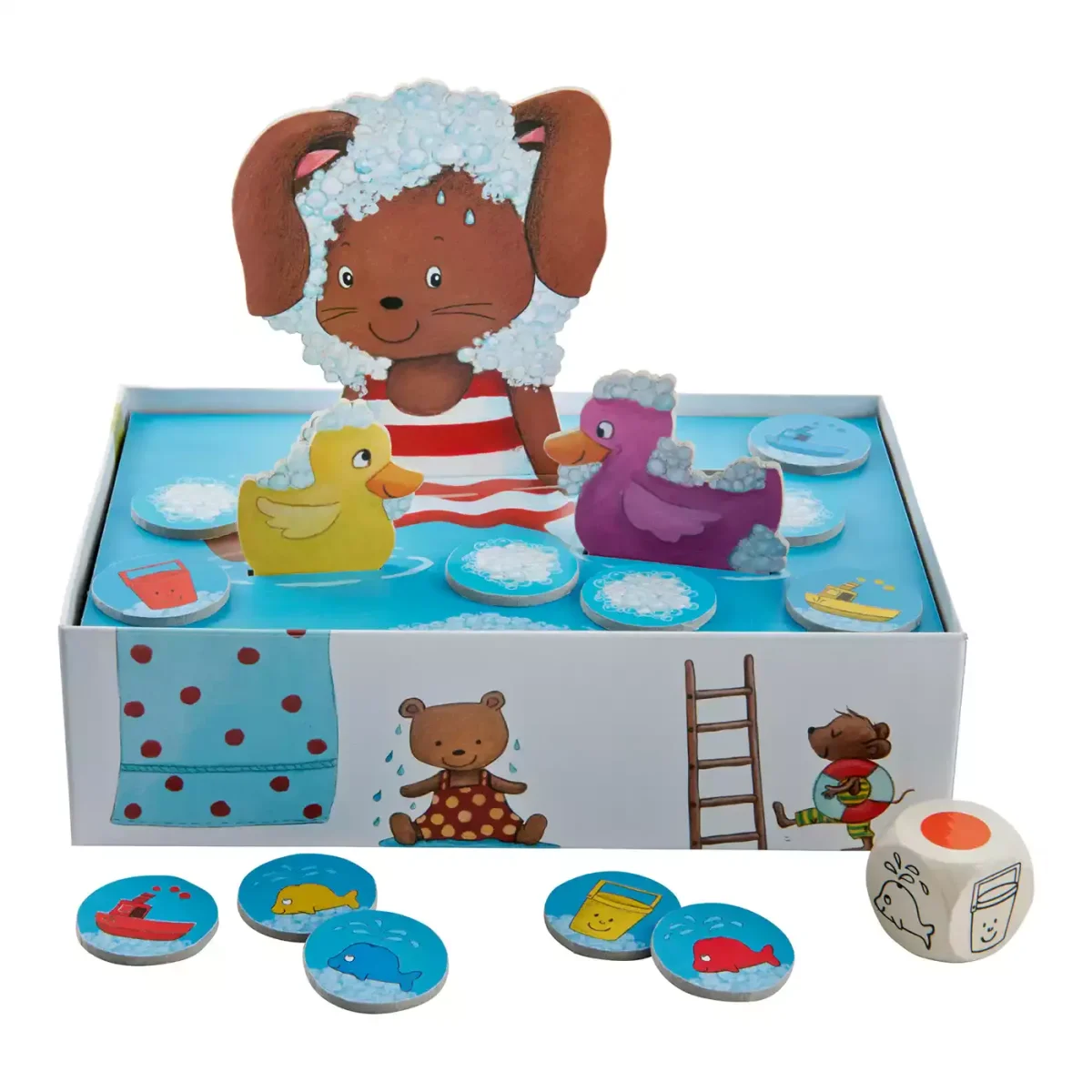 Badehase Blubbernase planscht mit seinen zwei Entchen in der Wanne. Dabei verteilt er alle seine Spielsachen im Wasser. Aber oh je! Schwuppdiwupp sind sie im Badeschaum untergetaucht. Bei dieser HABA-Spielesammlung helfen 2 bis 4 Kinder dem Badehasen, Eimer, Wal oder Schiff zu finden. Diese Spielesammlung enthält abwechslungsreiche Memo-, Rate- oder Sprachspiele rund um den Badespaß. Dabei sollen die Kinder Farben und die Symbole zuordnen bzw. sich merken, welches Spielzeug sie gesehen haben. Nebenbei trainiert diese erste HABA-Spielesammlung aus der Reihe „Meine ersten Spiele“ die Konzentration und die Merkfähigkeit von Kindern ab 2 Jahren. Und dank der kompakten Größe kann man sie überallhin mitnehmen – außer in die Badewanne vielleicht.