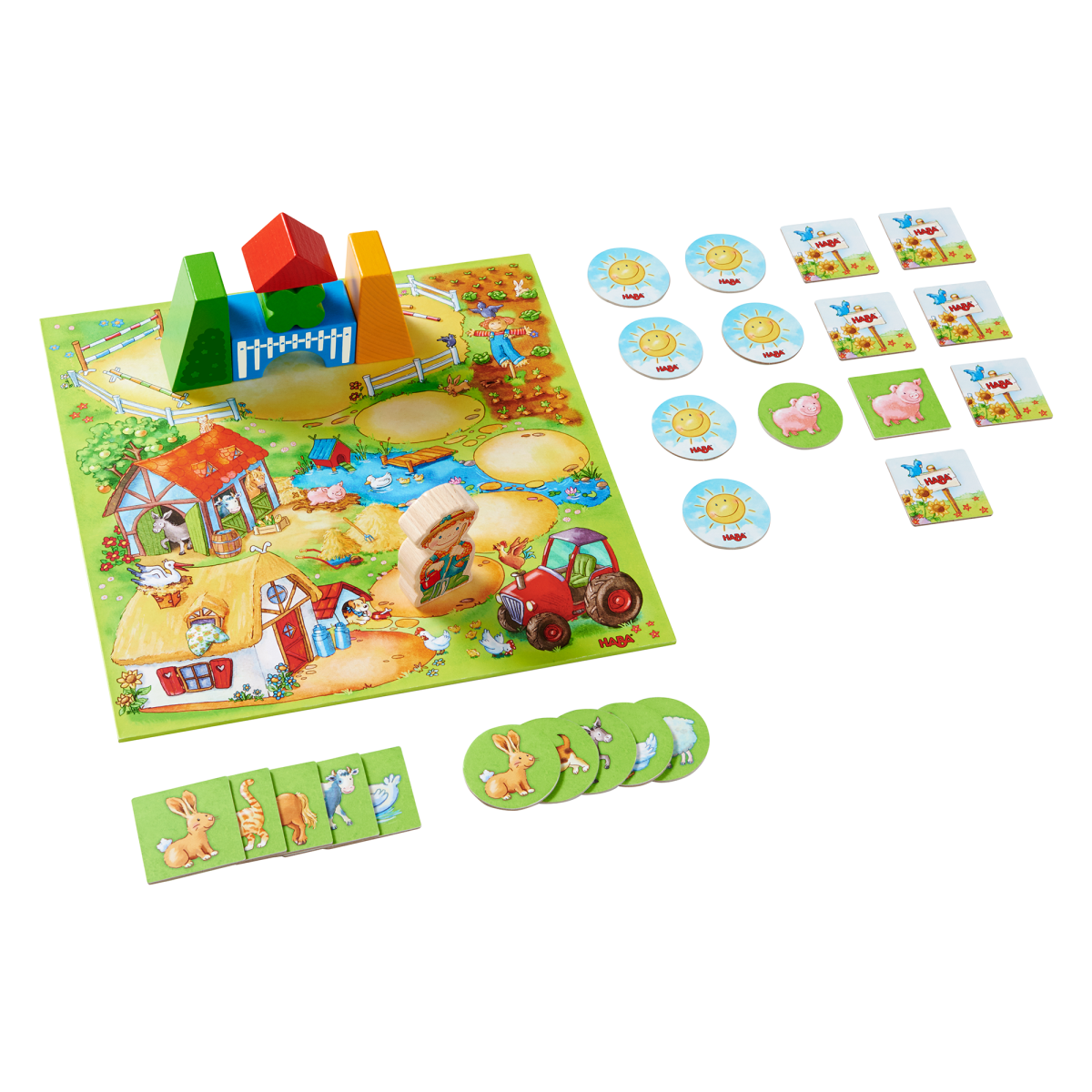 Das umfangreiche Spielmaterial aus stabiler Pappe und robustem Holz begeistert nicht nur mit seiner Langlebigkeit, sondern auch mit den liebevoll gestalteten Bauernhofmotiven. Dein Kind wird in unterschiedlichen Spielvarianten die Freude am Zuordnen, Merken, Bauen, Stapeln und Würfeln entdecken. Und dabei lernt es spielerisch die Hand-Auge-Koordination, die Feinmotorik und erste Regeln zu verstehen.